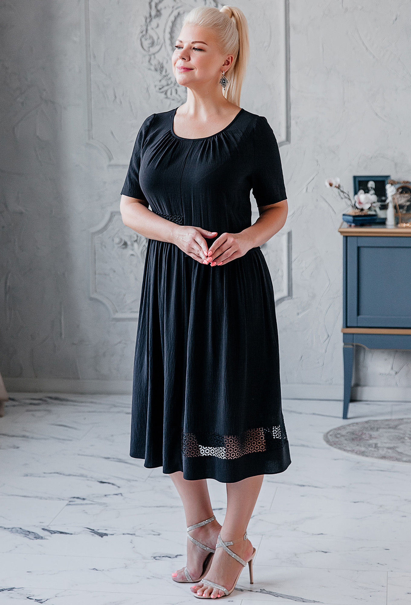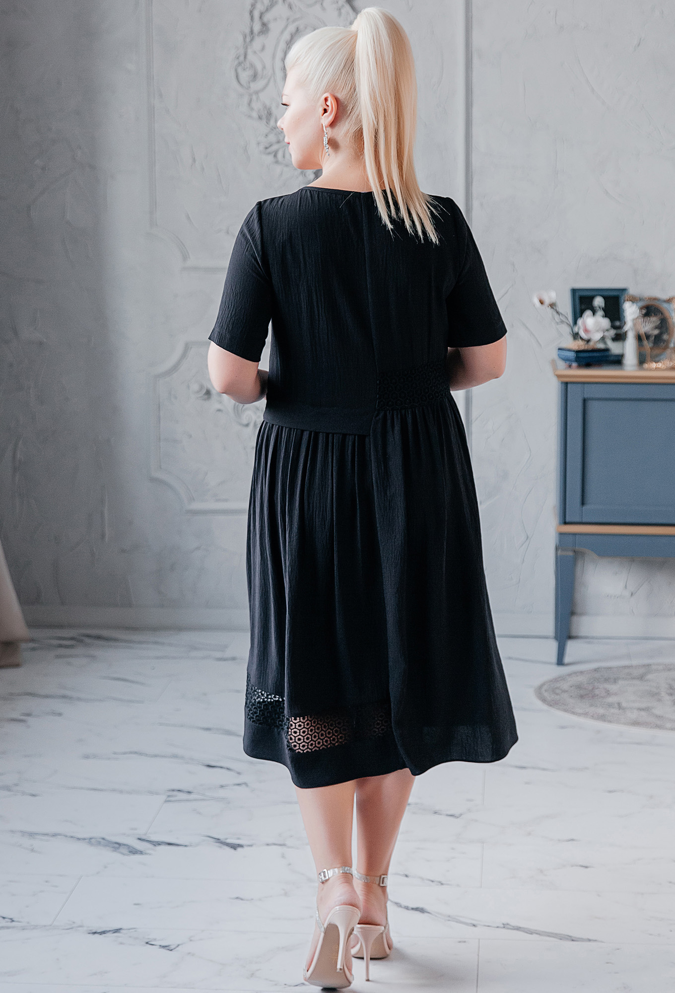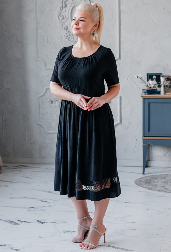Платье расширенного силуэта с коротким рукавом и округлой горловиной. Перед и спинка ассиметричные, с отрезным лифом и вставками, кружева по низу и по линии талии.