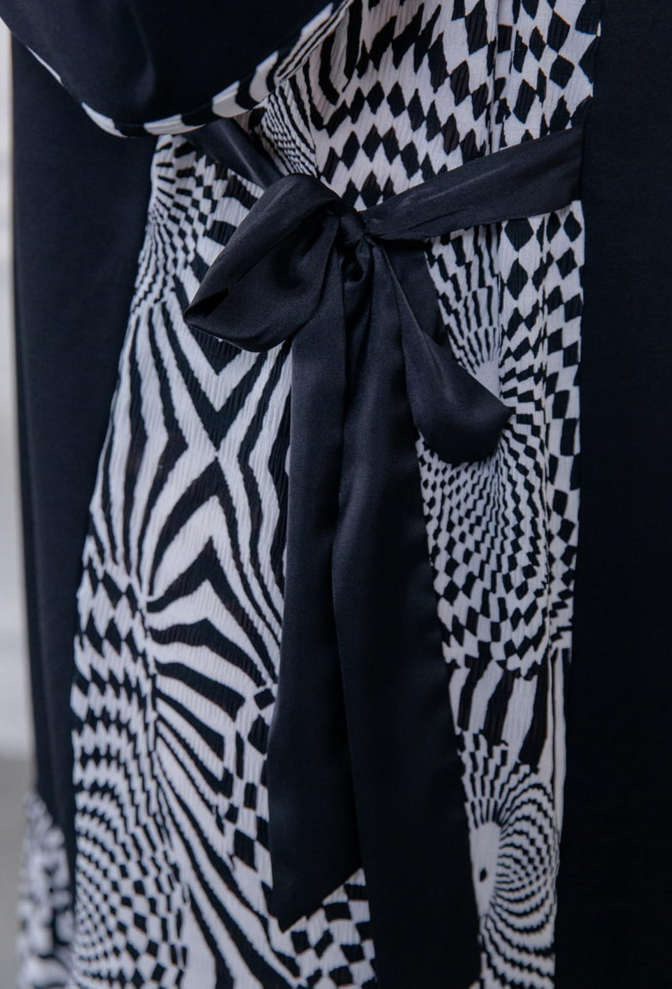 Платье комбинированное расширенного силуэта с рукавом 3/4 с притачными манжетами. Горловина округлая с притачной бейкой. По низу переда и спинки и по бокам вставки из контрастной плиссировки и декоративные завязки.