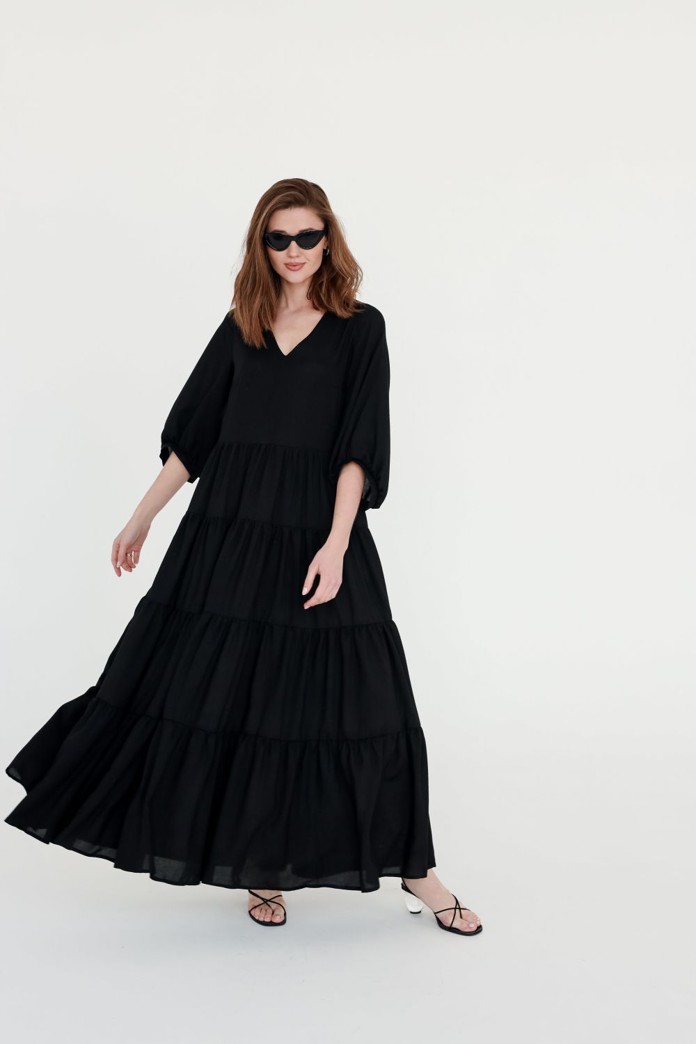 Платье черное с ярусной юбкой.