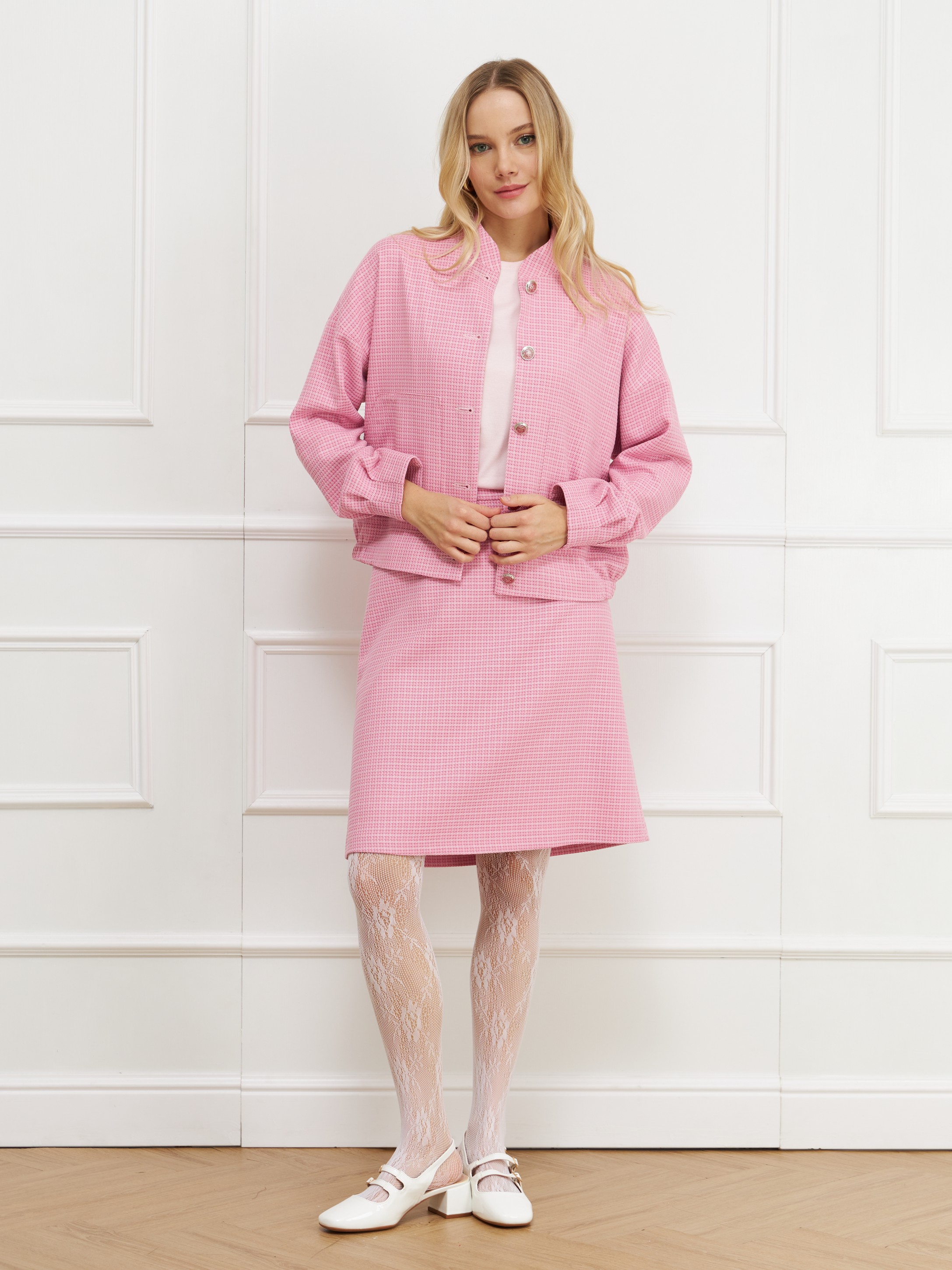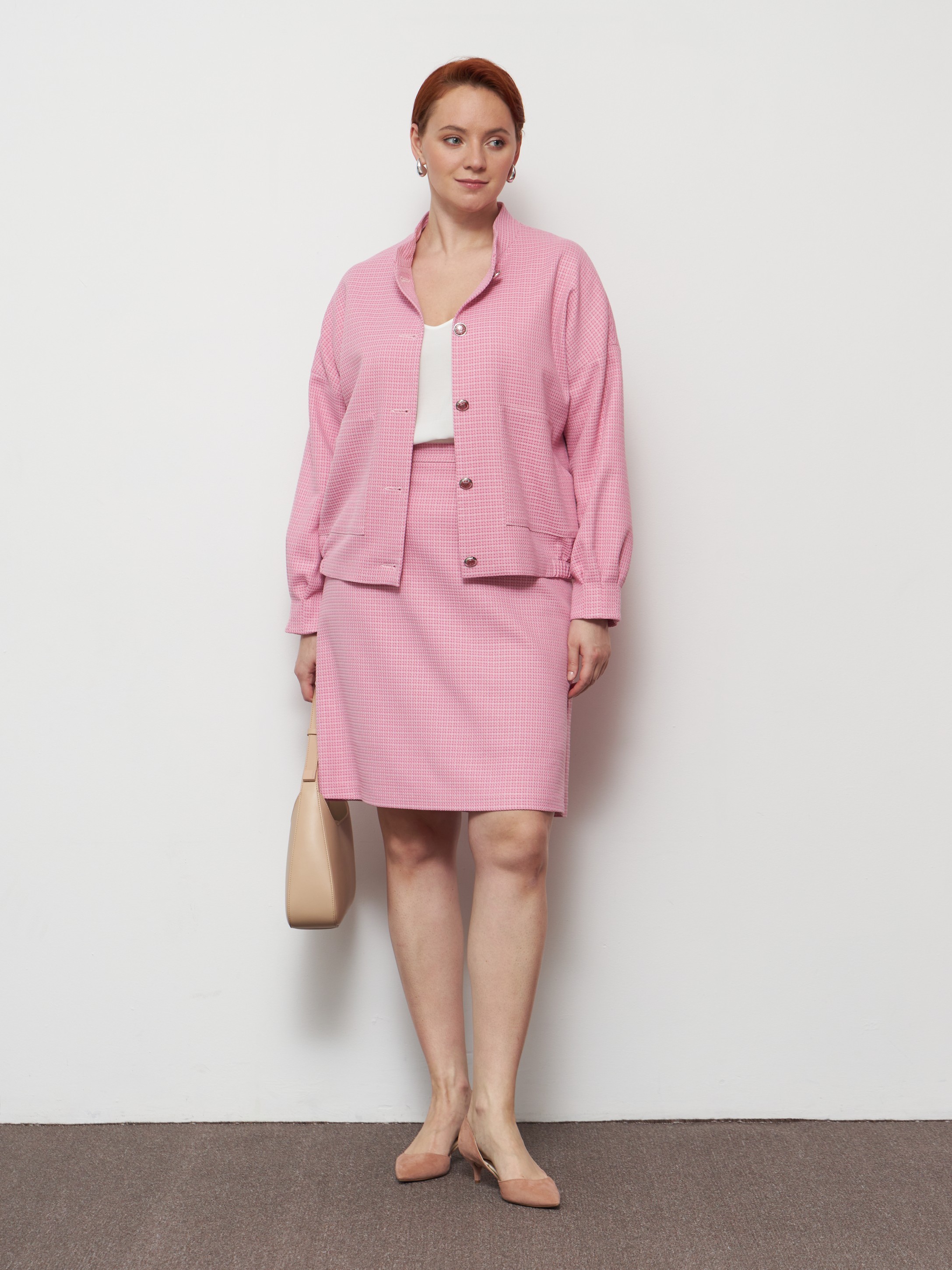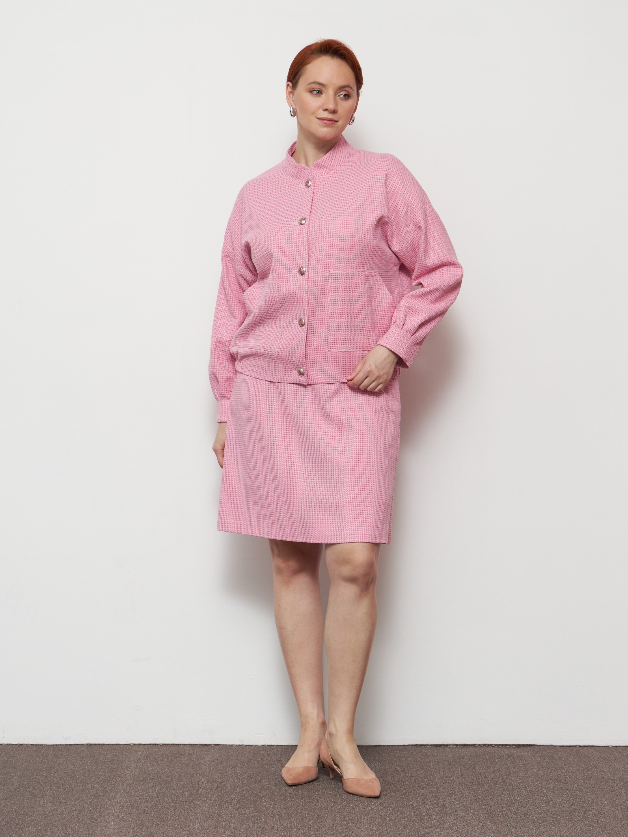 Жакет-бомбер нежного розового оттенка, застегивается винтажными пуговицами. Свободный воротник- стойка не облагает шею, мягкий силуэт со спущенной линией плеча не сковывает движения. Накладные карманы, складки по низу рукава и эластичные вставки по бокам придают расслабленность и мягкость. Модель сшили из прочного фактурного материала «пье-де-пуль» на основе дышащей вискозы. Внутри предусмотрели приятный телу эластичный подклад. На фото в паре Юбка А-2028 ЛМА(В5) и  Джемпер С-25 КЛС(В5).