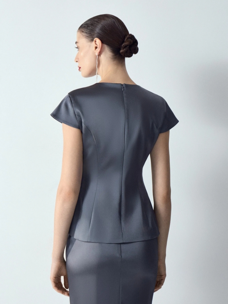 Эта элегантная блуза создаст благородный образ к любому случаю. Она выполнена из плотного атласа и отлично садится по фигуре. Благодаря высокой доле ацетата в составе блузка не мнётся и не электризуется. Также материал обладает эластичностью. Приталенная модель с намёком на баску и изящными вытачками формирует грациозный силуэт. Визуально вытягивает, грамотно подчёркивает женственный контраст между талией и бёдрами. Эффектный графитово-стальной оттенок с глубиной и блеском производит сильное впечатление. Такая вещь одинаково хороша и в офисе, и на корпоративе, и на свидании, подойдёт для выхода в театр или встречи с подругами. Завершить образ можно юбкой из комплекта. Ансамбль станет ядром базового гардероба в стиле современной классики