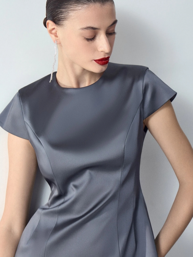 Эта элегантная блуза создаст благородный образ к любому случаю. Она выполнена из плотного атласа и отлично садится по фигуре. Благодаря высокой доле ацетата в составе блузка не мнётся и не электризуется. Также материал обладает эластичностью. Приталенная модель с намёком на баску и изящными вытачками формирует грациозный силуэт. Визуально вытягивает, грамотно подчёркивает женственный контраст между талией и бёдрами. Эффектный графитово-стальной оттенок с глубиной и блеском производит сильное впечатление. Такая вещь одинаково хороша и в офисе, и на корпоративе, и на свидании, подойдёт для выхода в театр или встречи с подругами. Завершить образ можно юбкой из комплекта. Ансамбль станет ядром базового гардероба в стиле современной классики