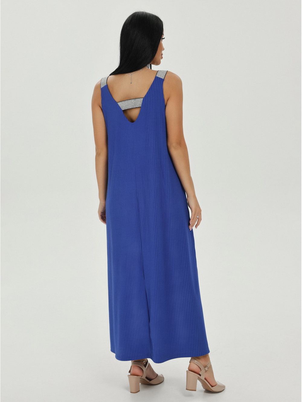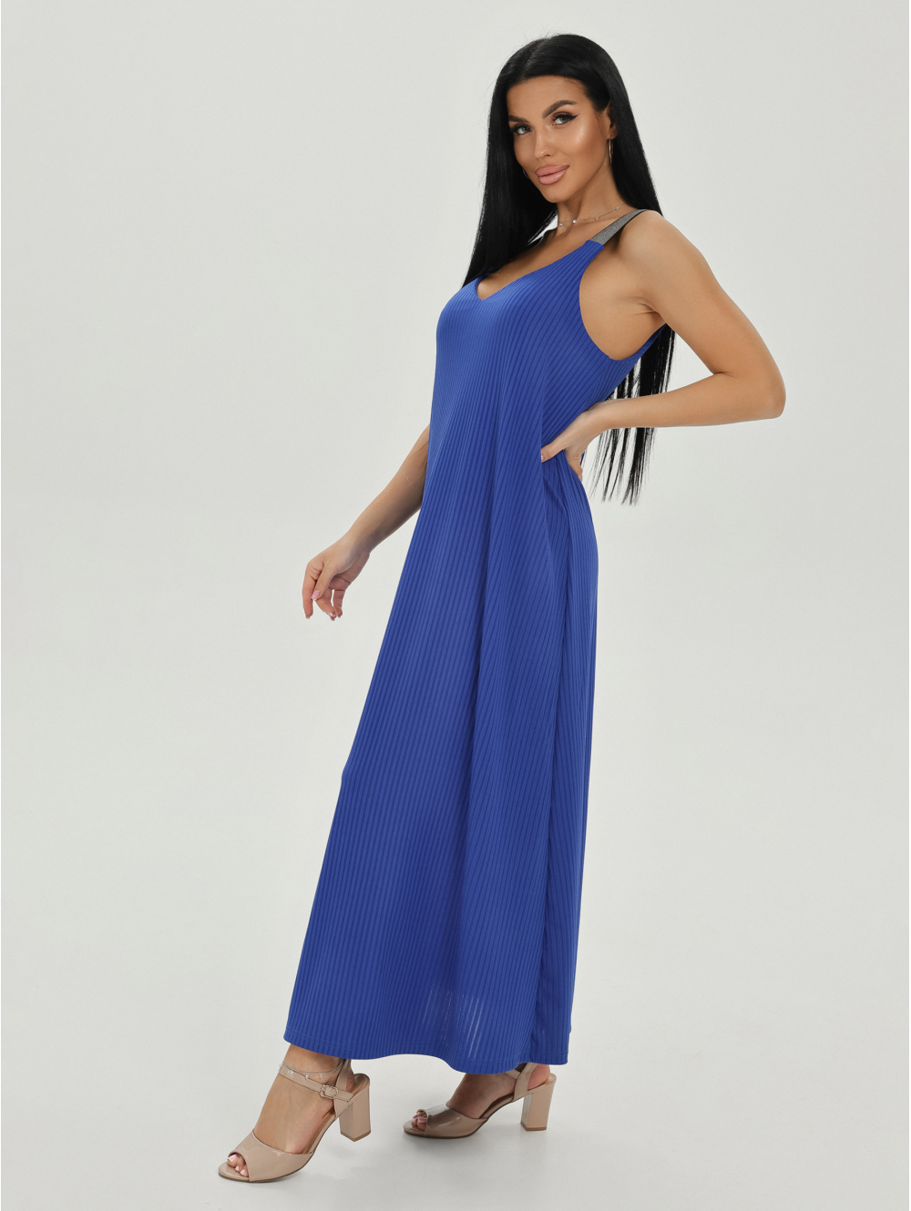 Сарафан женский А-образного силуэта, длиной до щиколотки. Вырез горловины на полочке и спинке V- образный.