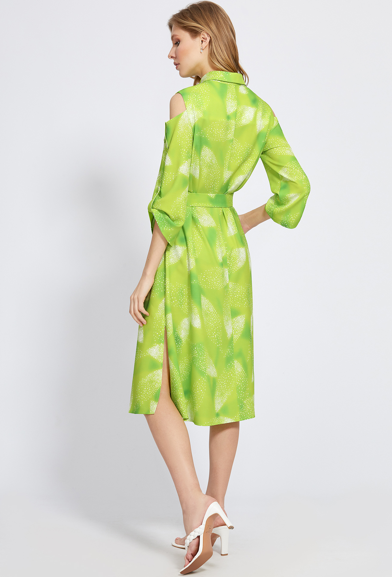 Это стильное платье-рубашка из вискозной ткани представляет собой идеальное сочетание удобства и модного дизайна. Основной цвет платья — яркий женственный принт. Элегантный А-образный силуэт и миди длина добавляют платью воздушности, а открытые плечи придают современный акцент. Платье оснащено отложным воротником со стойкой и центральной застёжкой на петли и пуговицы, создавая классический образ рубашки. Укороченные рукава с патами и пуговицами добавляют аккуратности. Практичные боковые швы с карманами и разрезами обеспечивают удобство. Линия талии подчёркивается элегантным поясом с пряжкой в тон, что делает силуэт более выразительным. Это изысканное платье подойдет как для повседневных, так и для более формальных случаев, добавляя в Ваш образ изысканности и стиля.