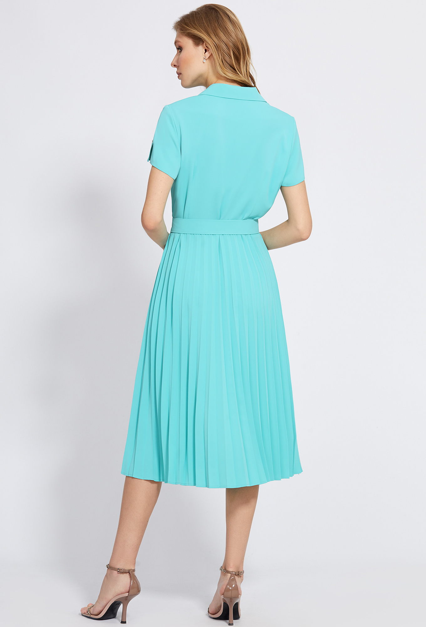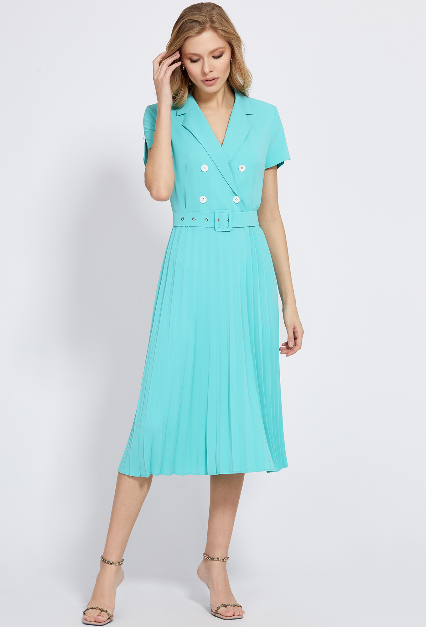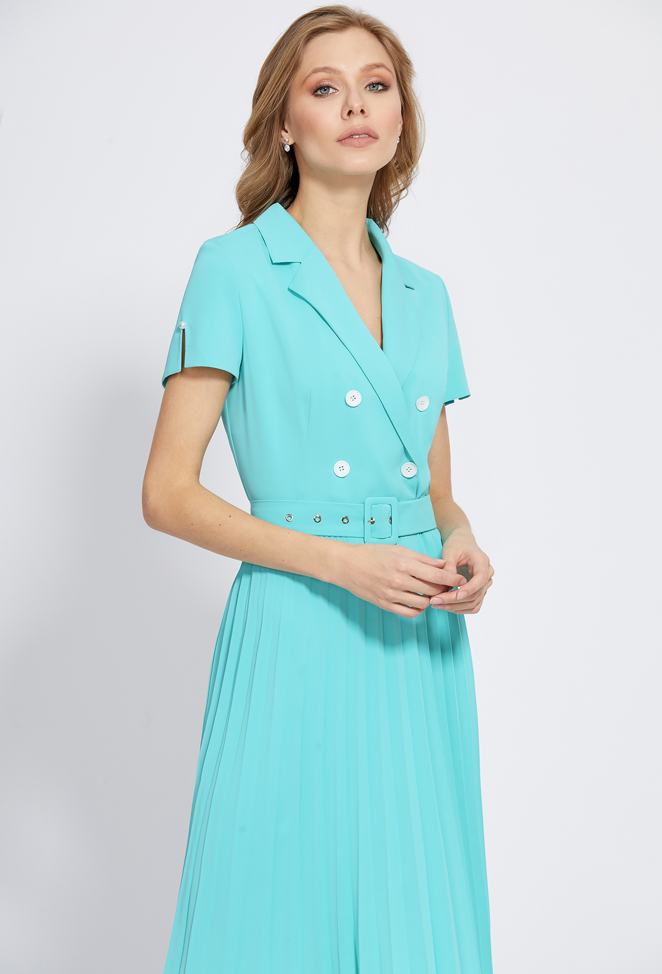 Откройте для себя это уникальное платье, идеально подходящее для особых случаев, которое сшили из приятной немнущейся ткани нежного лазурного оттенка. Лиф модели с отложным воротником с лацканами, с V-образным вырезом горловины и с имитацией двубортной застёжки с пуговицами. Рукава короткие втачные, с разрезами и украшены бусинами. Эффектность модели также придаёт плиссированная юбка, добавляя изящности при движении. Для удобства при носке, в левом боковом шве обработана застёжка на потайную молнию. Завершить образ помогает пояс с пряжкой в тон, выгодно подчёркивающий талию.