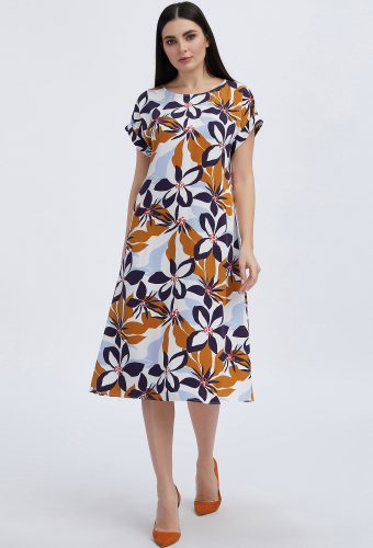 Стильное платье-трапеция с цельнокроенными рукавами с манжетами и округлым вырезом горловины; платье лёгкое, свободное, выполнено из приятного к телу 100% итальянского вискозного материала с ярким цветочным принтом; данная модель станет незаменимым вариантом, который сочетает в себе стиль и комфорт одновременно