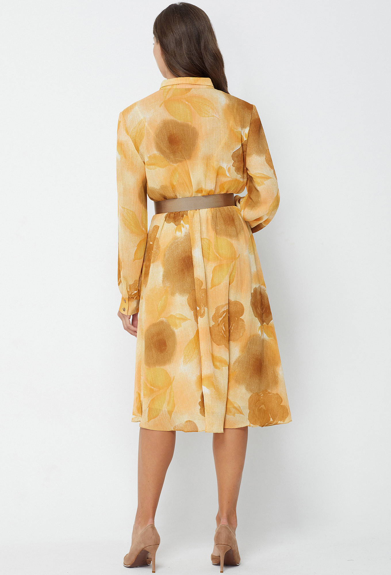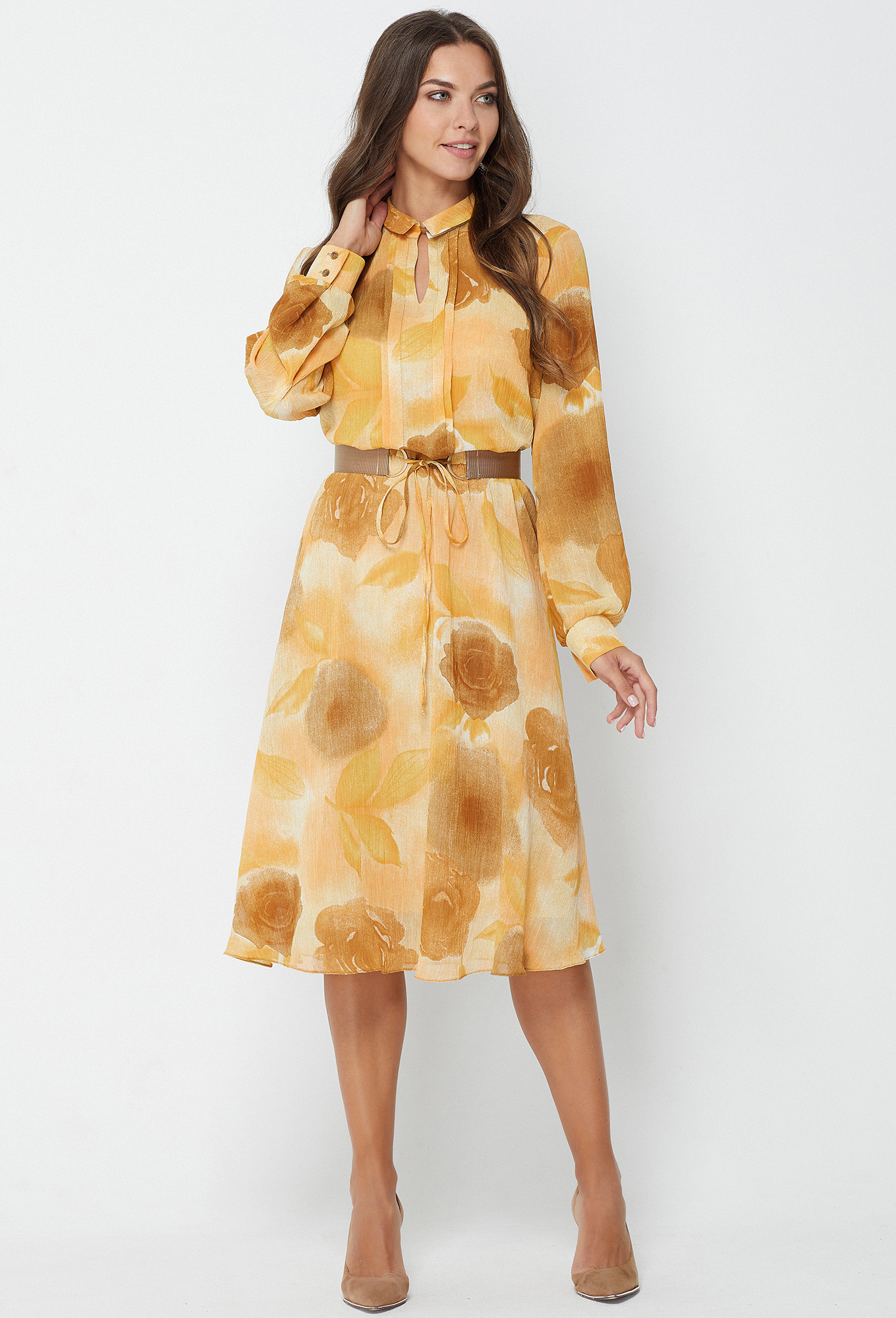 Модель платья-миди Х-образного силуэта – воплощение женственности. На это играют и нежный цветочный принт, и летящий в движении расклешённый подол, и щелевидный вырез горловины с защипами по переду лифа. Платье отрезное по линии талии и присборенное на эластичную тесьму, рукава втачные одношовные со сборкой по низу и с манжетами с застежкой на петли-пуговицы, воротник отложной с отрезной стойкой и застёжкой на одну навесную петлю и пуговицу. Линия талии дополнительно подчёркивается интересным поясом из тесьмы и основной ткани.