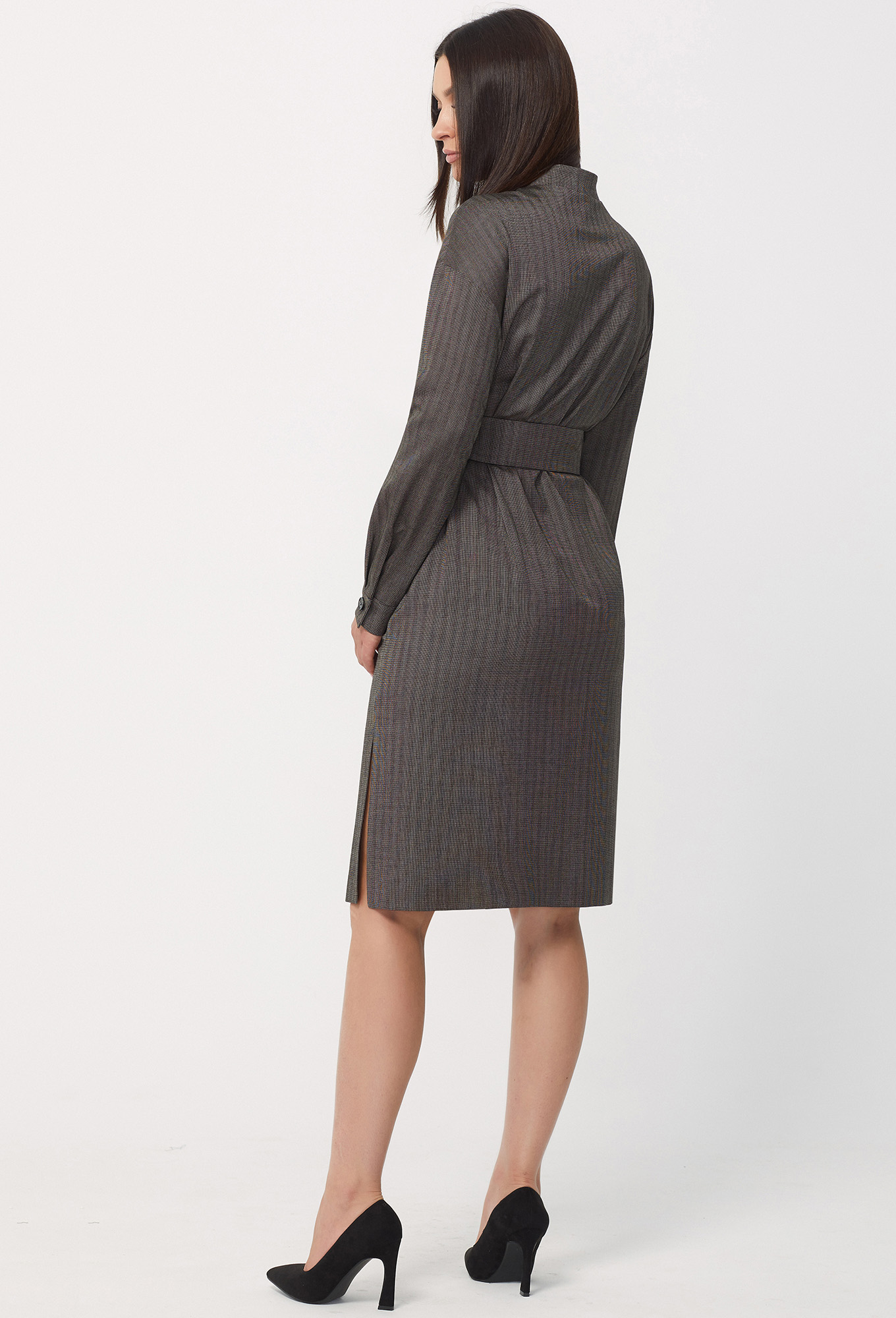 Комфортное платье-рубашка с воротником «мандарин». Перед с застёжкой на потайную молнию и одну отделочную пуговицу и с двумя накладными фигурными карманами с отделочными пуговицами. Платье со спущенной линией плеча с длинными притачными рукавами и манжетами с застёжкой на петли-пуговицы. Лёгкость модели придают разрезы в боковых швах. Ярким акцентом платья является интересный пояс из основной ткани, который помогает создать приталенный силуэт. Платье будет одинаково гармонично смотреться и с обувью на шпильке, и без каблука.