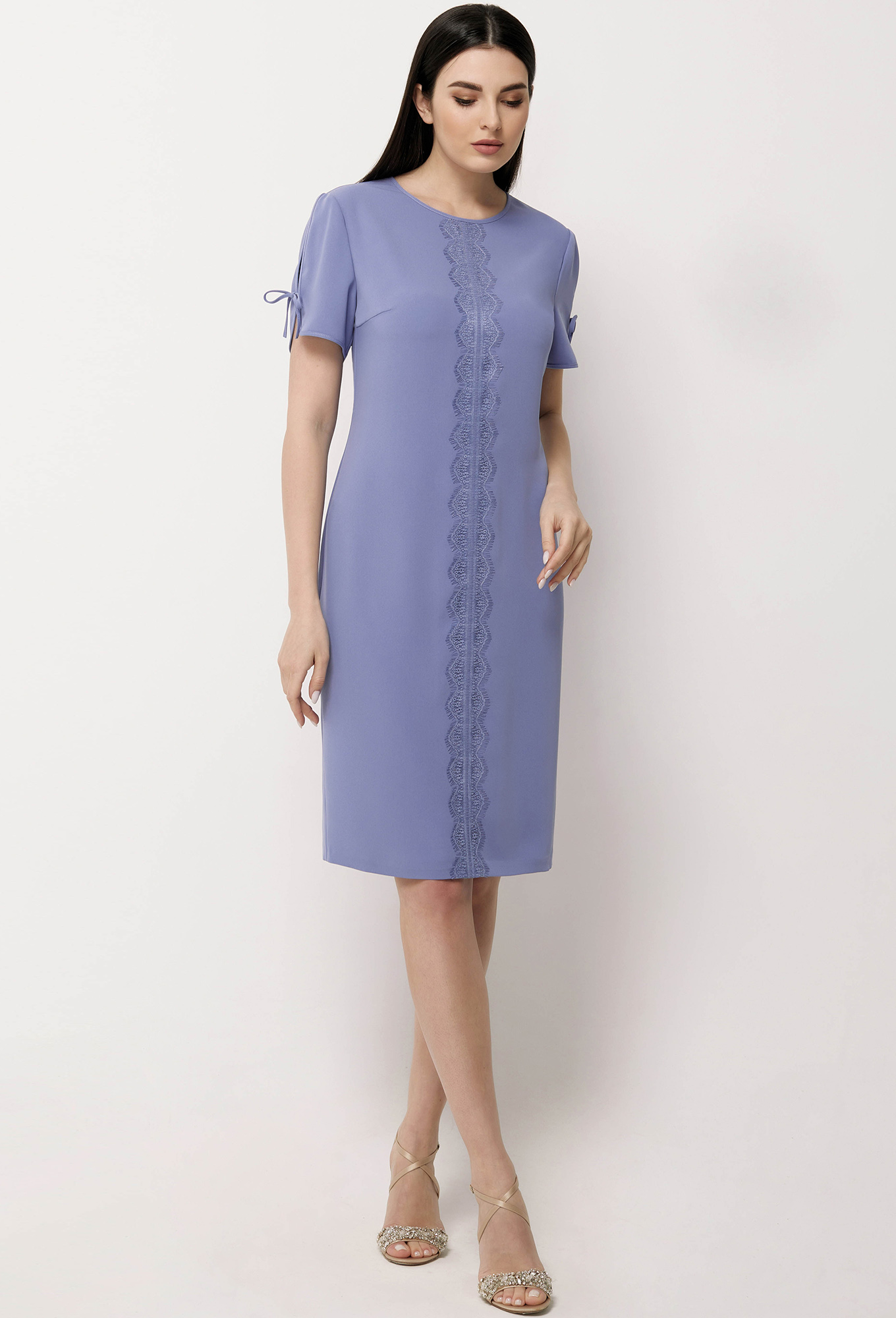 Эффектное платье с настрочным кружевом и контрастной отделкой по горловине и рукавам - неизбежно обратит на себя внимание, а втачные рукава интересного кроя с завязками в виде бантика создают очаровательный и женственный образ. Модель полуприлегающего силуэта выполнена из мягкой, приятной к телу, немнущейся ткани. В среднем шве спинки обработаны застёжка на потайную молнию и шлица.