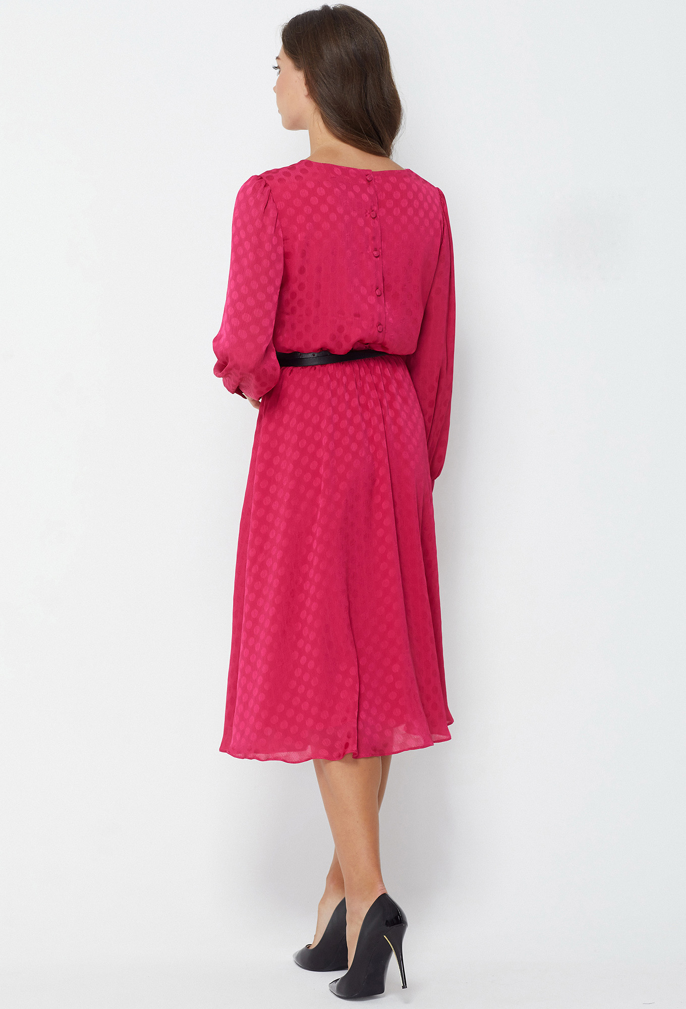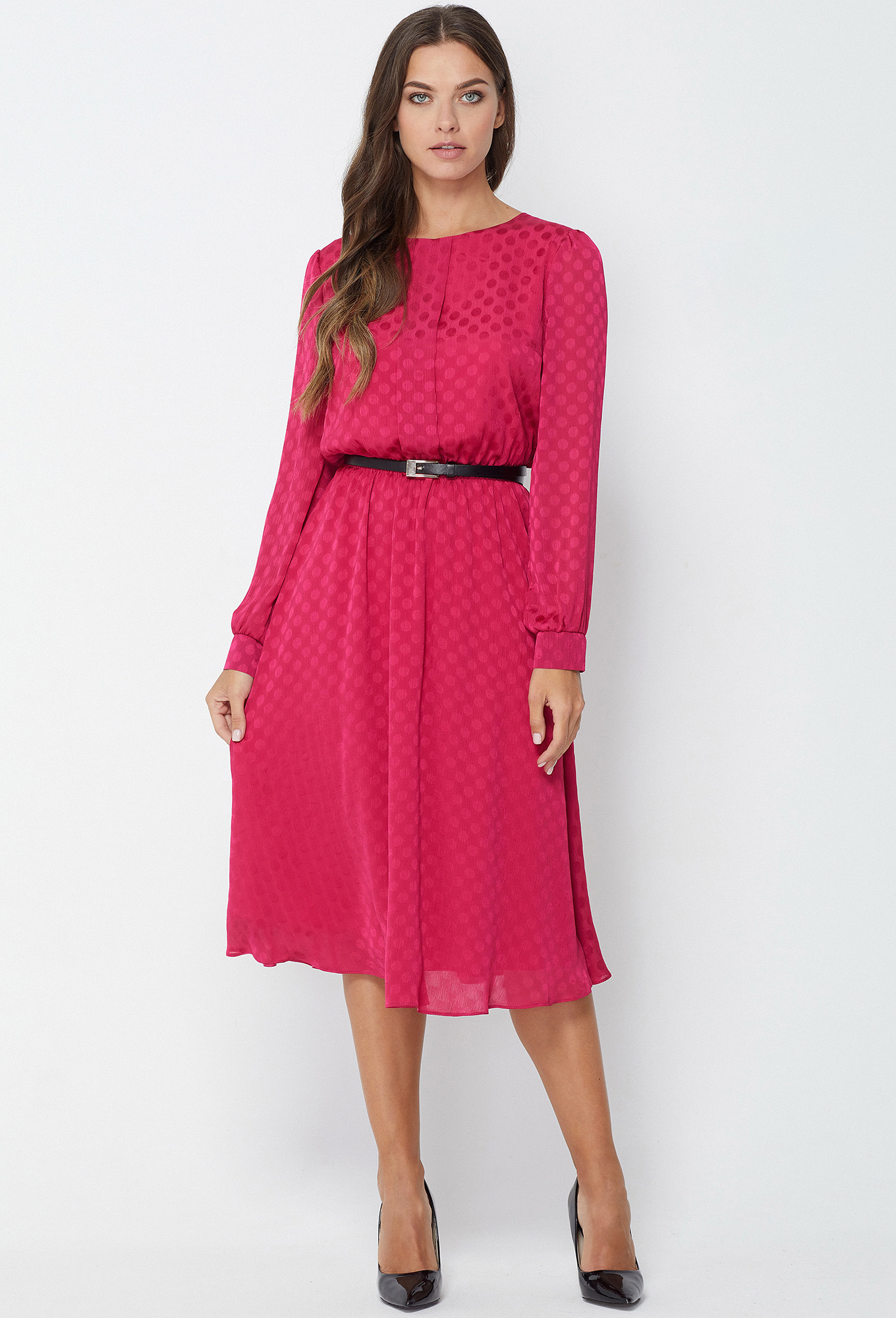 Красивое платье-миди Х-образного силуэта отрезное по линии талии и собранное на эластичную тесьму выполнено из однотонного фактурного шифона с дизайном "атласный горох" в тон платья и приятной к телу подкладки из 100% вискозы. Данная модель станет идеальной основой романтического образа благодаря: бантовой складке в верхней части переда, красивой застёжке на декоративные пуговицы на спинке, нежной драпировке, переходящей в мягкие складки, а также аккуратным втачным рукавам со сборной в верхней части оката и по низу, и манжетам с декоративными пуговицами. Линию талии дополнительно подчёркивает контрастный пояс-ремень с пряжкой.