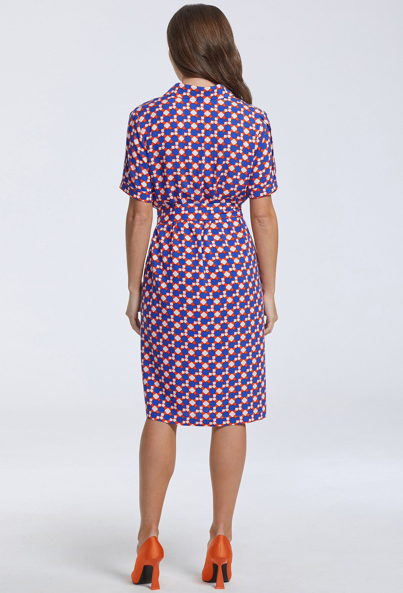 Платье-рубашка с V-образным вырезом горловины горловины и воротником аля «Поло» с декоративной пуговицей сшито из приятной итальянской вискозной ткани с ярким геометрическим принтом. В боковых швах обработаны функциональные карманы с отделкой в виде фигурных клапанов с пуговицами. Рукава втачные с отложными манжетами и бантовыми складками по центру. Прямой силуэт очень комфортен, а для создания приталенного силуэта предусмотрен пояс-завязка тон, красиво подчеркивающей женскую талию