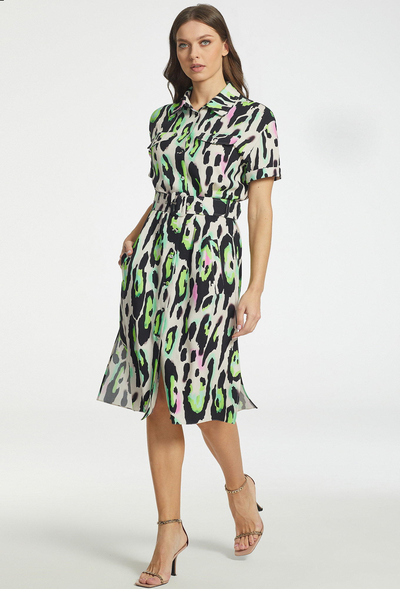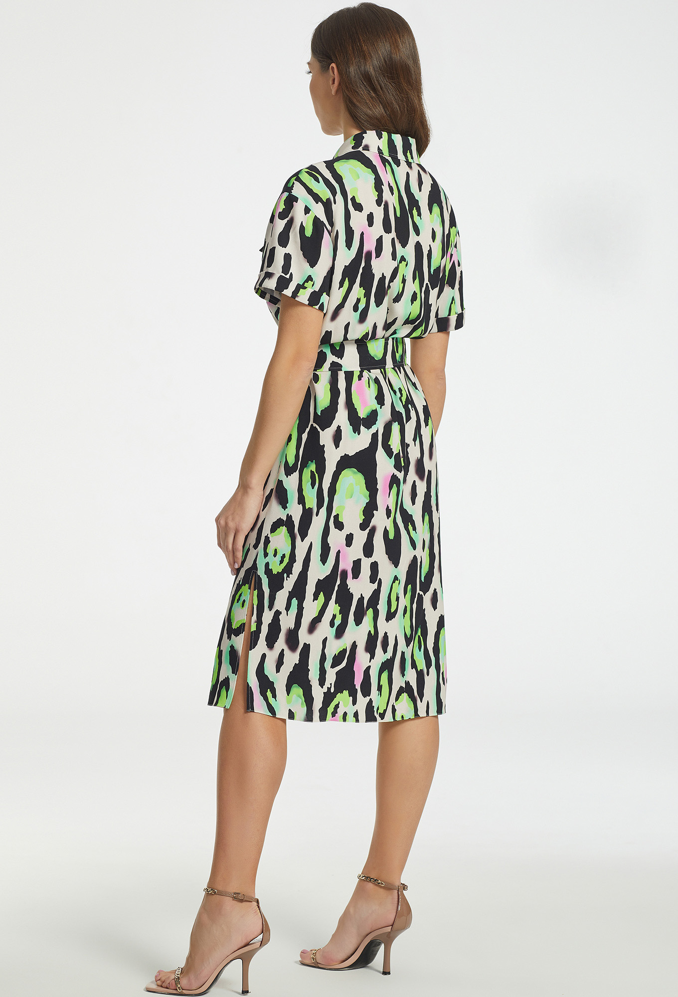 Платье-рубашка с оригинальным принтом. Модель прямого силуэта с отложным воротником с отрезной стойкой, с центральной застежкой на петли и пуговицы, со спущенной линией плеча и притачными короткими рукавами с отложными манжетами. Изделие дополнено отделочными нагрудными клапанами, функциональными карманами с листочками и поясом. Боковые швы заканчиваются разрезами. Платье будет отличным вариантом для работы или прогулки. Пояс может отличаться от студийного фото.
