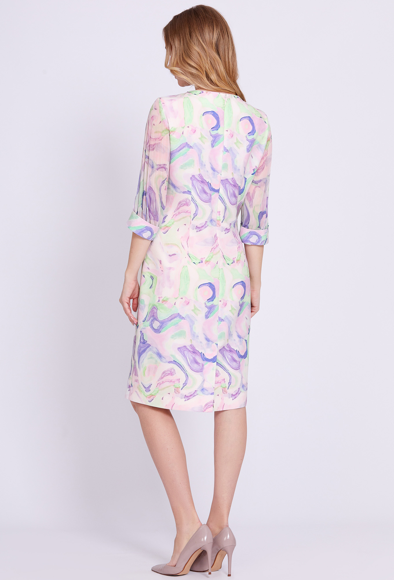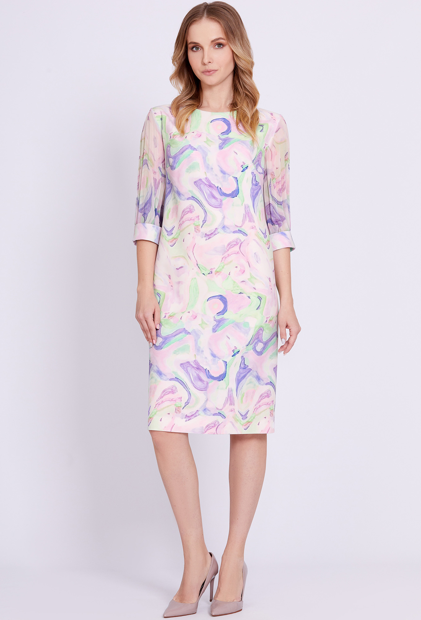 Безупречное в своей красоте платье с округлой формой горловины. Изделие выполнили из мягкой приятной ткани с абстрактным принтом в нежных розово-сиреневых оттенках с добавлением зелёной мяты, подчёркивающей свежесть образа и идентичного по цвету шифона. Модель полуприлегающего силуэта, в среднем шве спинки обработаны застёжка на потайную молнию и шлица. Несмотря на лаконичный крой, платье не лишено интересных деталей, таких как полупрозрачные плиссированные рукава с отложными манжетами. Уникальная, красивая, современная – эта модель, которая не может отсутствовать в вашем гардеробе.