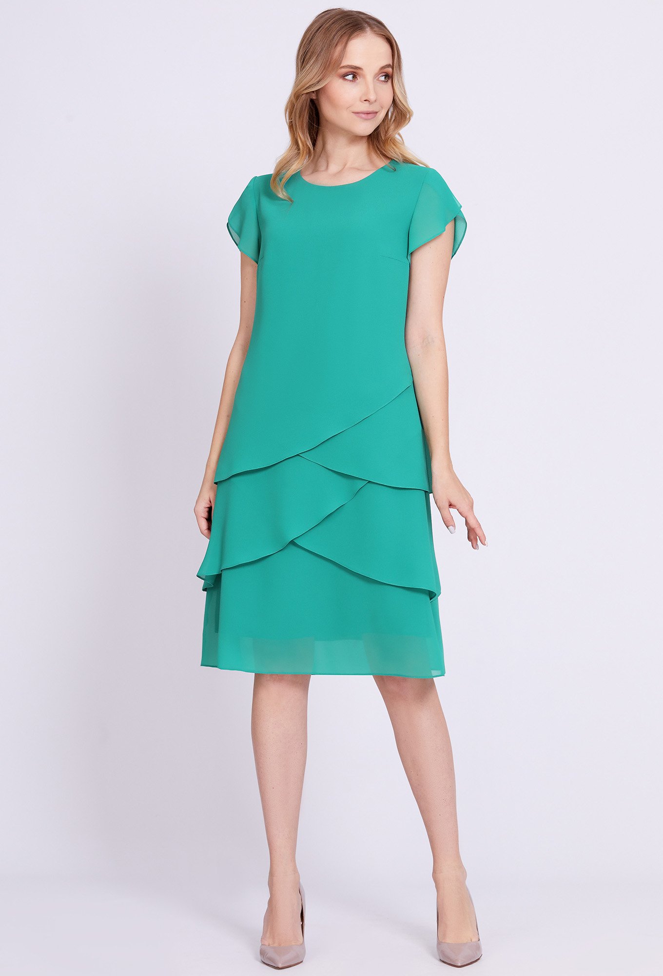 Это элегантное платье подойдёт для любого важного события – свадьбы, юбилея или торжественного ужина. Модель А-образного силуэта с округлым вырезом горловины и короткими воздушными рукавами. Платье украшено асимметричными оборками, которые мягко развеваются во время движения, придавая силуэту динамичность и лёгкость. Изделие сшито из мягкой однотонной ткани и приятной подкладки, обеспечивающей должное удобство при ношении.
