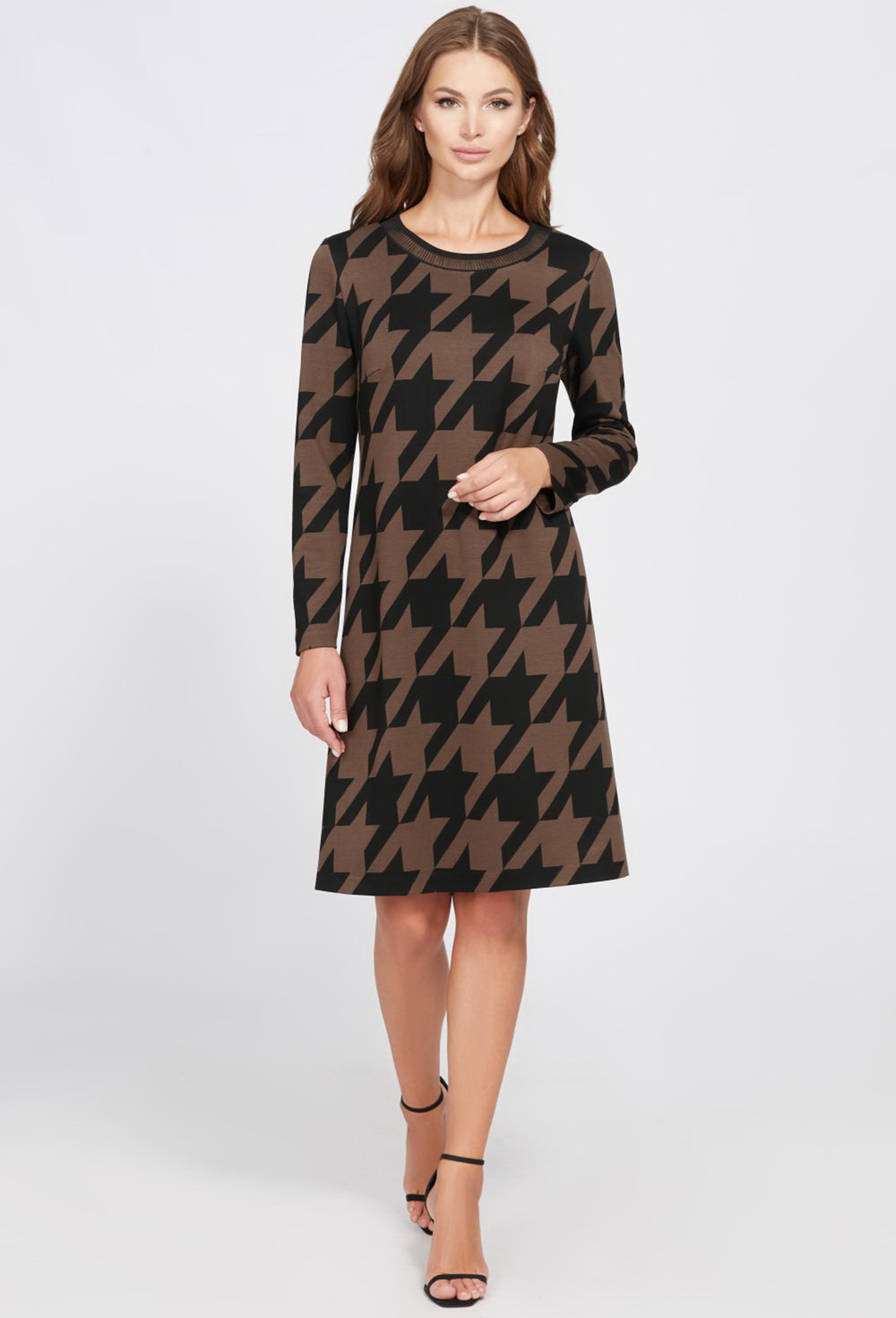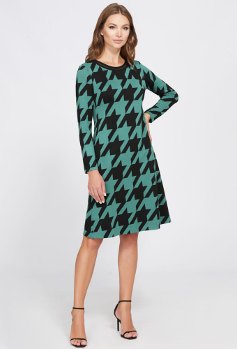 Платье А-образного силуэта с длинными втачными рукавами не только эффектно смотрится, благодаря интересному дизайну в виде крупной гусиной лапки, но и не уступает в вопросах комфорта, так как сшито из мягкого приятного к телу итальянского трикотажа с добавлением вискозы. Горловина изделия обработана отделочной трикотажной тесьмой. Платье будет уместно смотреться как в офисе с нестрогим дресс-кодом, а также прекрасно подойдёт для светского мероприятия.