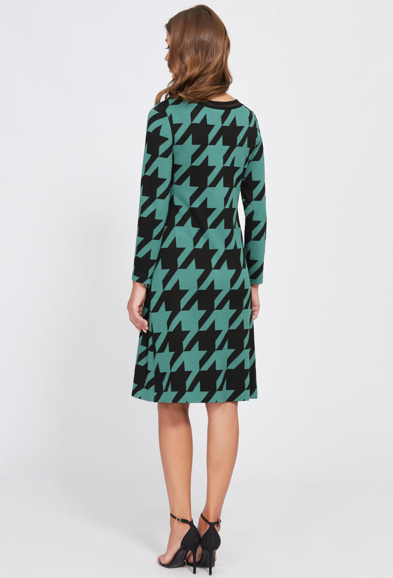 Платье А-образного силуэта с длинными втачными рукавами не только эффектно смотрится, благодаря интересному дизайну в виде крупной гусиной лапки, но и не уступает в вопросах комфорта, так как сшито из мягкого приятного к телу итальянского трикотажа с добавлением вискозы. Горловина изделия обработана отделочной трикотажной тесьмой. Платье будет уместно смотреться как в офисе с нестрогим дресс-кодом, а также прекрасно подойдёт для светского мероприятия.