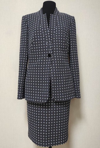 Комплект состоит из жакета и юбки. Жакет полуприлегающего силуэта дополнили отложным воротником и декоративными клапанами. Рукава втачные двухшовные. На подкладке.