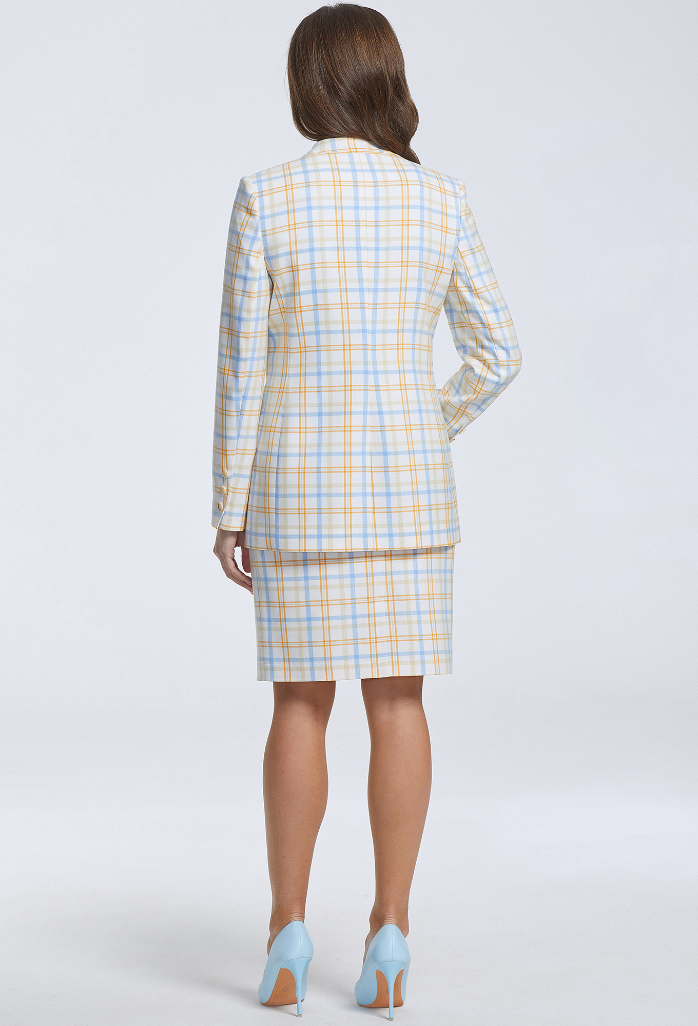Стильный однобортный жакет полуприлегающего силуэта выполнен из мягкой приятной испанской ткани с добавлением вискозы с интересным сочетанием клетки. Перед с небольшой цельнокроеной стойкой, с глубоким фигурным вырезом, с застёжкой на две петли-пуговицы, с скругленными бортами, с горизонтальными карманами с листочками и отделочными пуговицами. Спинка с отрезной стойкой. Рукава втачные двухшовные со шлицами и отделочными пуговицами. На подкладке.