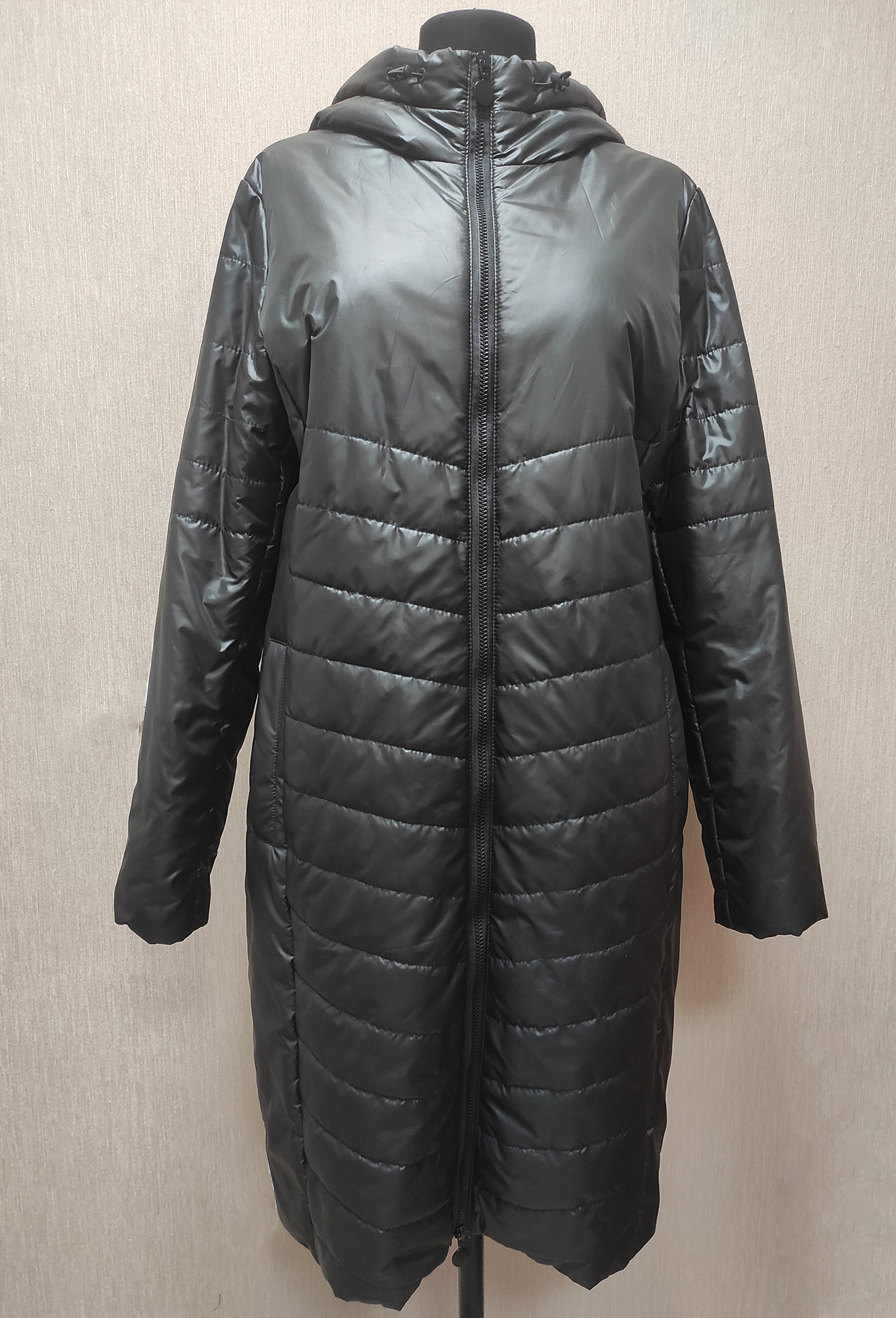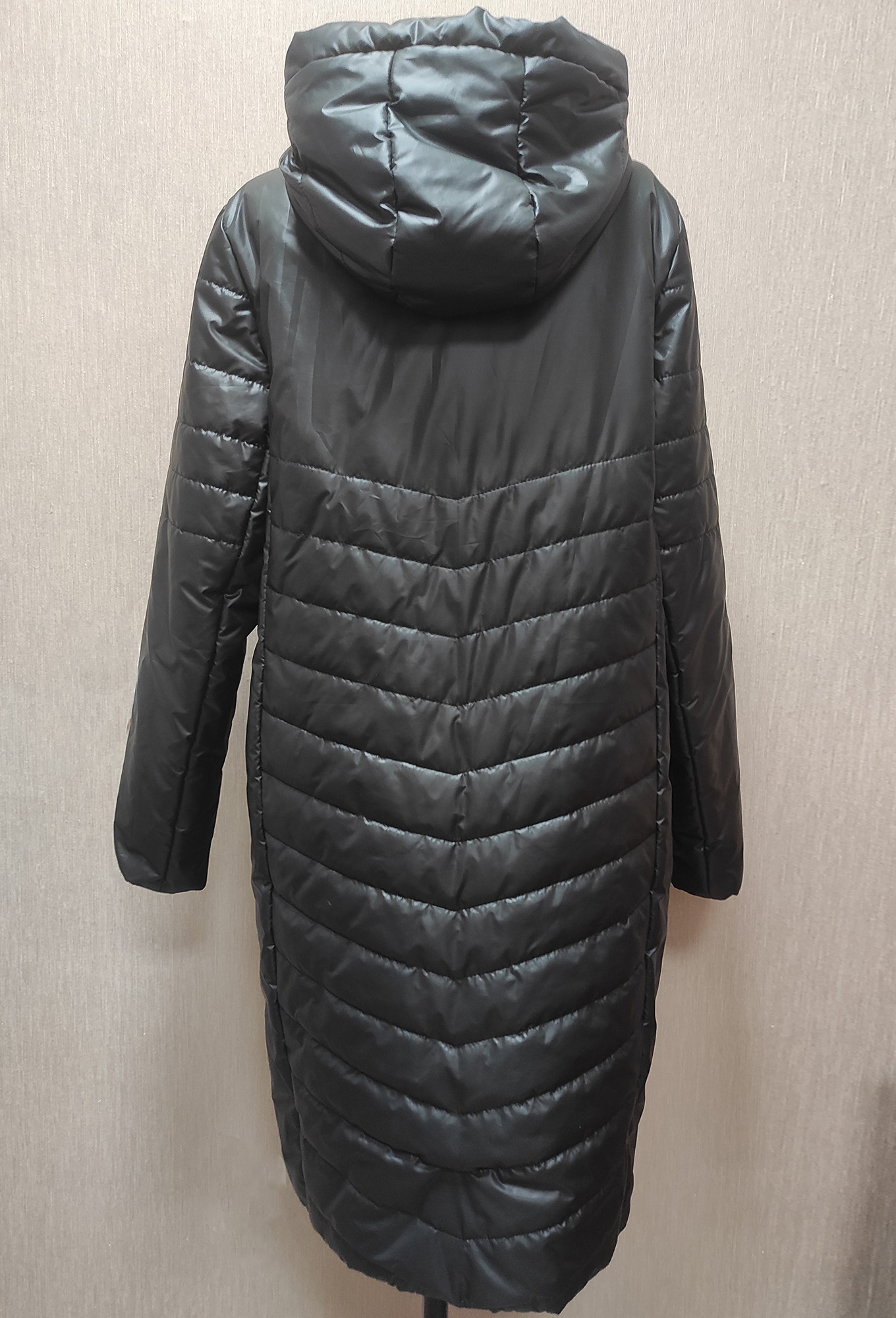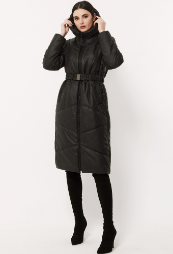 Длинная стёганная куртка прямого силуэта с застёжкой на молнию и с цельнокроеным капюшоном защитит от мороза и ветра в ненастный день. Модель сшили из гладкого непромокаемого материала.
