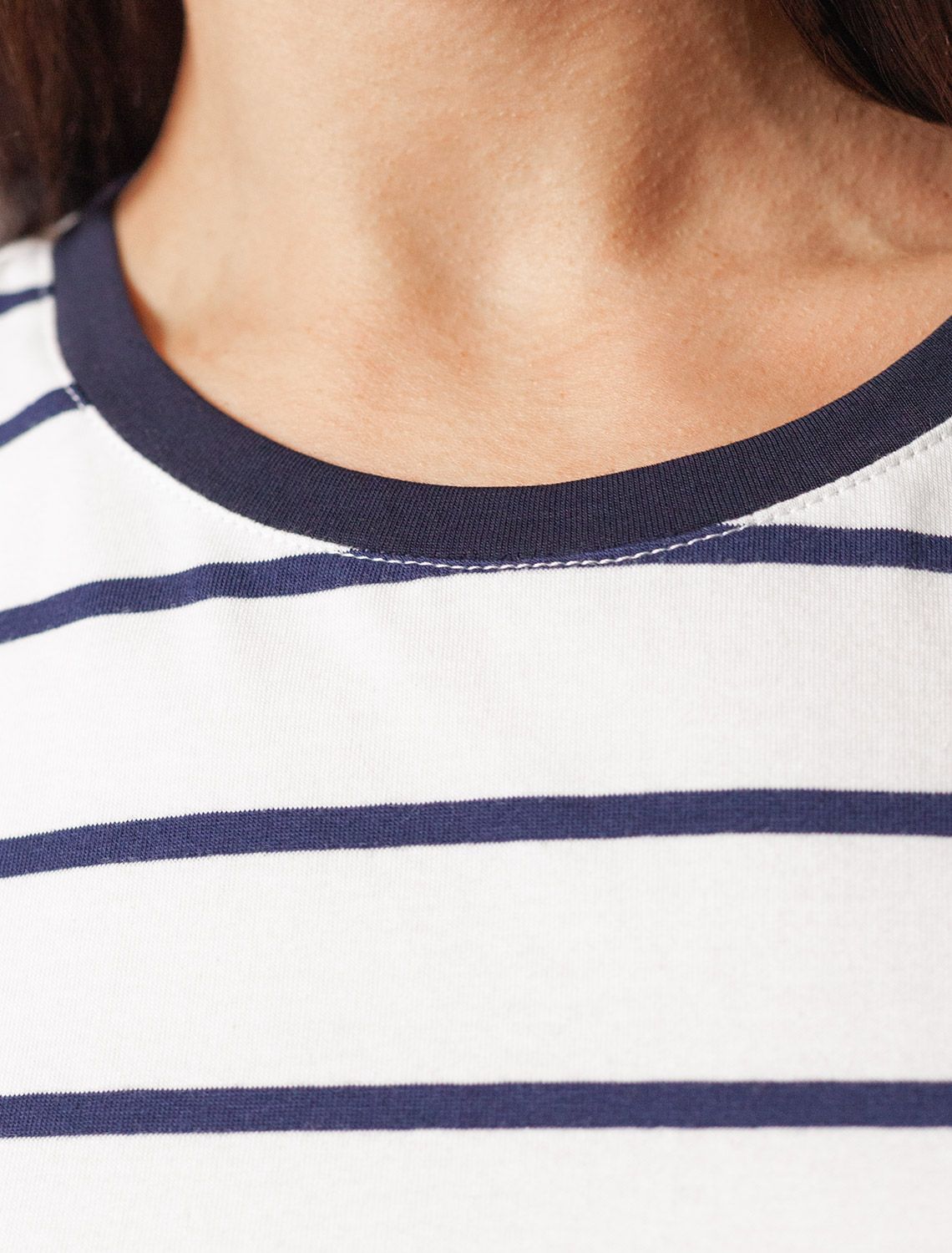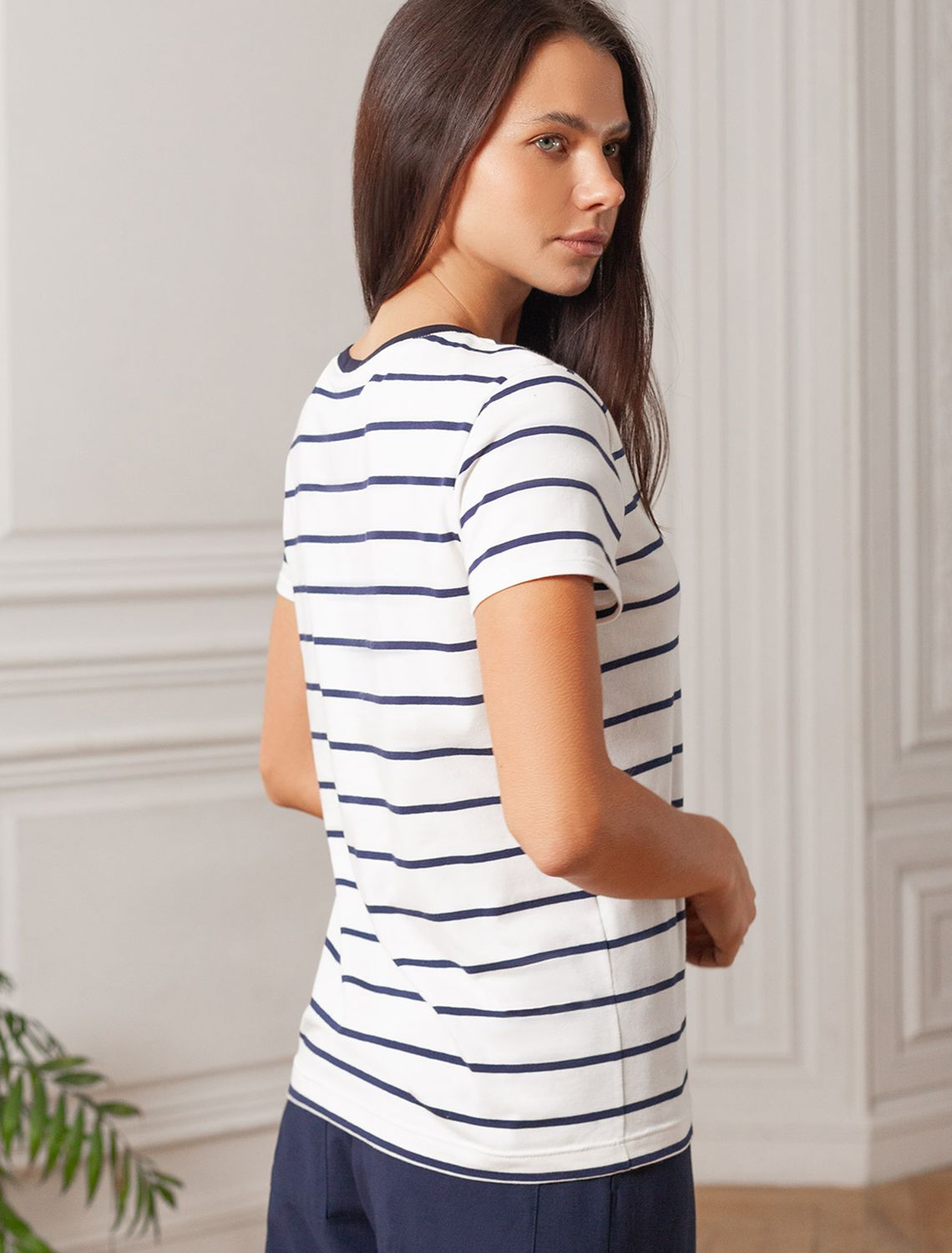 Стильная и модная женская футболка белого цвета в темно-синюю полоску станет отличным дополнением к вашему гардеробу. Футболка плотностью 170 Г/м2 изготовлена из премиального хлопка с добавлением эластана. Добавление эластана в состав изделия способствует формоустойчивости. Эта классическая футболка подходит для создания кэжуал образа на каждый день и идеально подойдет для работы. Модель не мнется, что делает ее практичным вариантом для активных женщин, которые ценят стиль и удобство. Благодаря современному принту полоска эта футболка легко комбинируется с различными элементами гардероба. Она станет универсальным решением для тех, кто предпочитает комфортный стиль casual. Повседневная футболка подчеркнет вашу индивидуальность и позволит вам выглядеть привлекательно в любой ситуации. Легкость в уходе и высокая износостойкость делают ее незаменимой вещью в вашем гардеробе. Одевайте эту модель как на работу, так и на встречу с друзьями — она всегда будет уместна! Стильная и практичная модель с простым кроем и лаконичным дизайном - идеальный вариант для тех, кто ценит качество, минимализм и классический стиль в одежде.