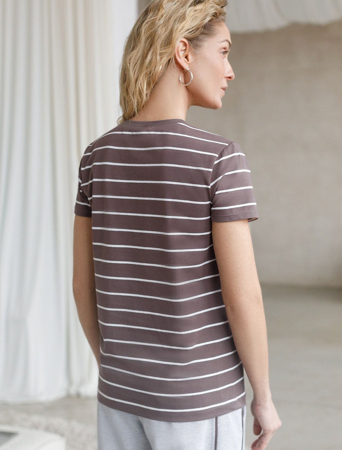 Стильная и модная женская футболка кофейного цвета в белую полоску станет отличным дополнением к вашему гардеробу. Футболка плотностью 170 Г/м2 изготовлена из премиального хлопка с добавлением эластана. Добавление эластана в состав изделия способствует формоустойчивости. Эта классическая футболка подходит для создания кэжуал образа на каждый день и идеально подойдет для работы. Модель не мнется, что делает ее практичным вариантом для активных женщин, которые ценят стиль и удобство. Благодаря современному принту полоска эта футболка легко комбинируется с различными элементами гардероба. Она станет универсальным решением для тех, кто предпочитает комфортный стиль casual. Повседневная футболка подчеркнет вашу индивидуальность и позволит вам выглядеть привлекательно в любой ситуации. Легкость в уходе и высокая износостойкость делают ее незаменимой вещью в вашем гардеробе. Одевайте эту модель как на работу, так и на встречу с друзьями — она всегда будет уместна! Стильная и практичная модель с простым кроем и лаконичным дизайном - идеальный вариант для тех, кто ценит качество, минимализм и классический стиль в одежде.