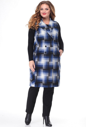 Жилет женский прямого силуэта. Перед с нагрудными вытачками и вертикальными рельефами, в которых обработаны карманы. Спинка с кокеткой в верхней части, со средним швом и двумя талиевыми вытачками. Средний шов по низу переходит в шлицу. Горловина с воротником-стойка и отложным лацканом. Застежка двубортная. Жилет на подкладке.