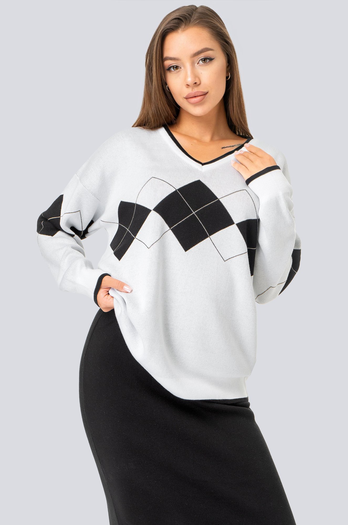 Прямой крой юбки и длина миди придают ей элегантность и позволяют подчеркнуть женственные формы, а джемпер с V-образным вырезом горловины и рисунком в виде ромбов добавляет игривости и, одновременно, классической строгости. Длинные рукава джемпера делают его универсальным вариантом для весны и осени.
