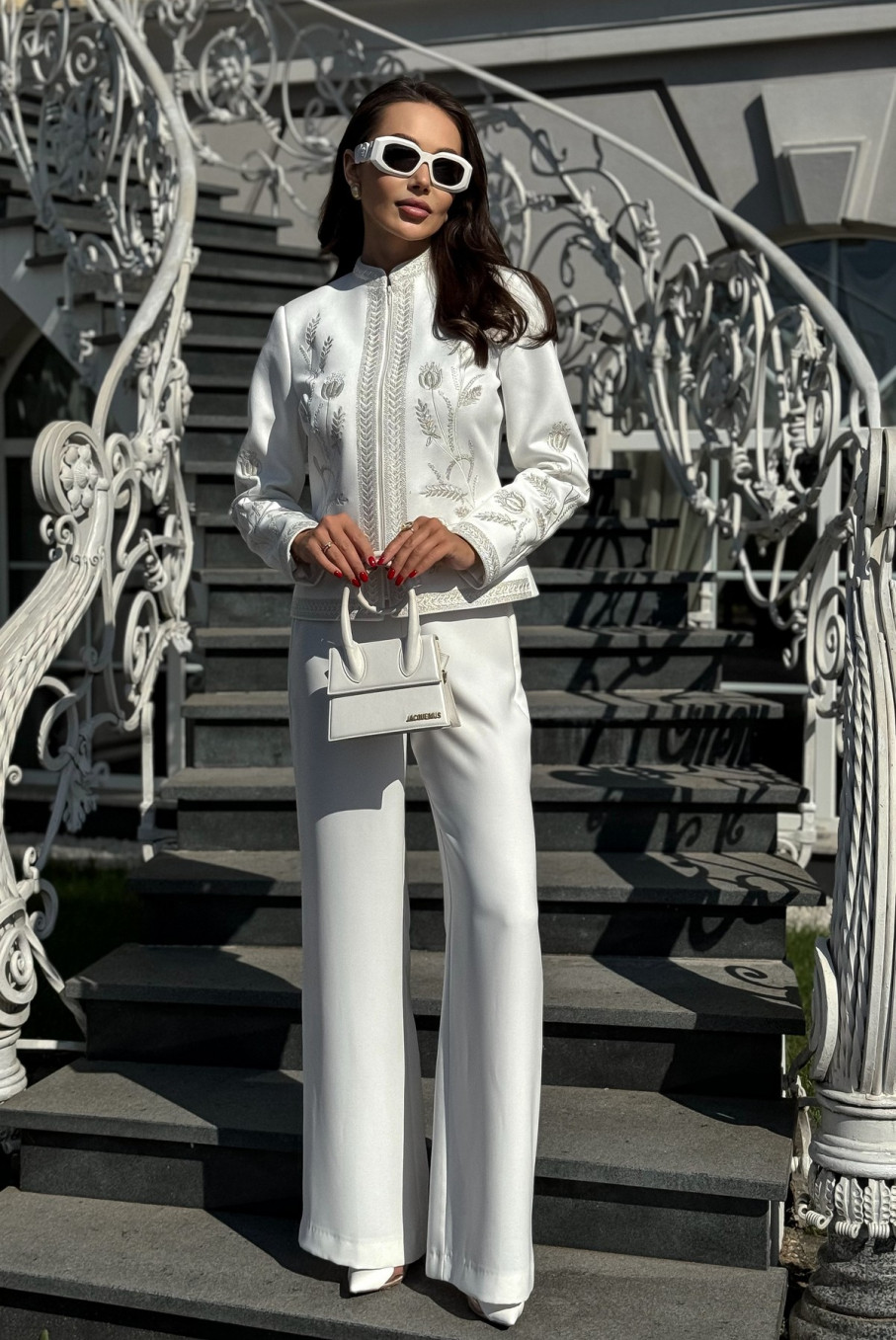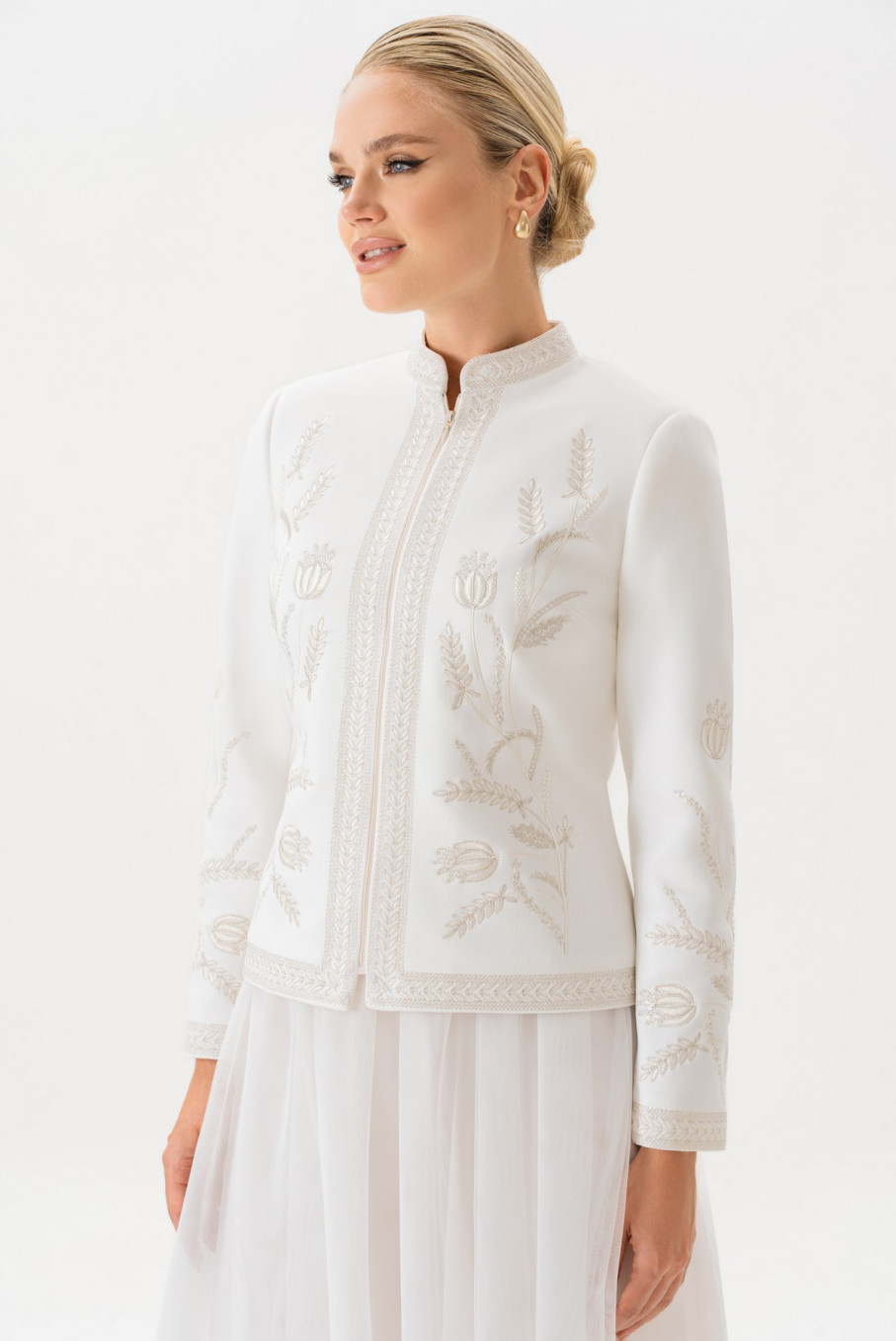 Для тех, кто предпочитает универсальные решения, модель идеально подойдёт и как праздничная одежда женская вечерняя. Белый цвет традиционно ассоциируется с чистотой, лёгкостью и торжественностью, а изящная вышивка создаёт ощущение утончённого стиля. Такой жакет способен подчеркнуть женственность и элегантность, делая образ завершённым.