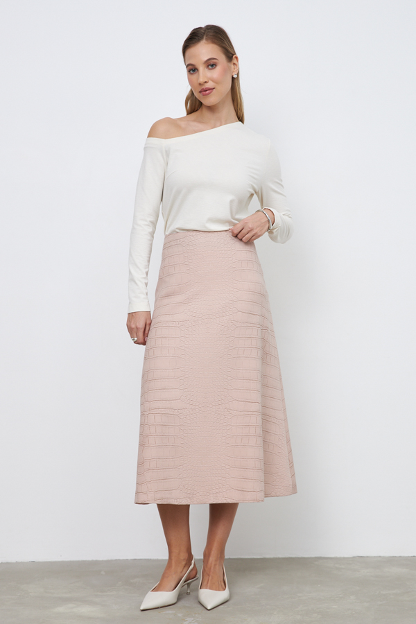 Джемпер из эластичного полотна полуприлегающего силуэта. Вырез горловины имеет асимметричную форму. Один рукав втачной, другой-типа реглан.