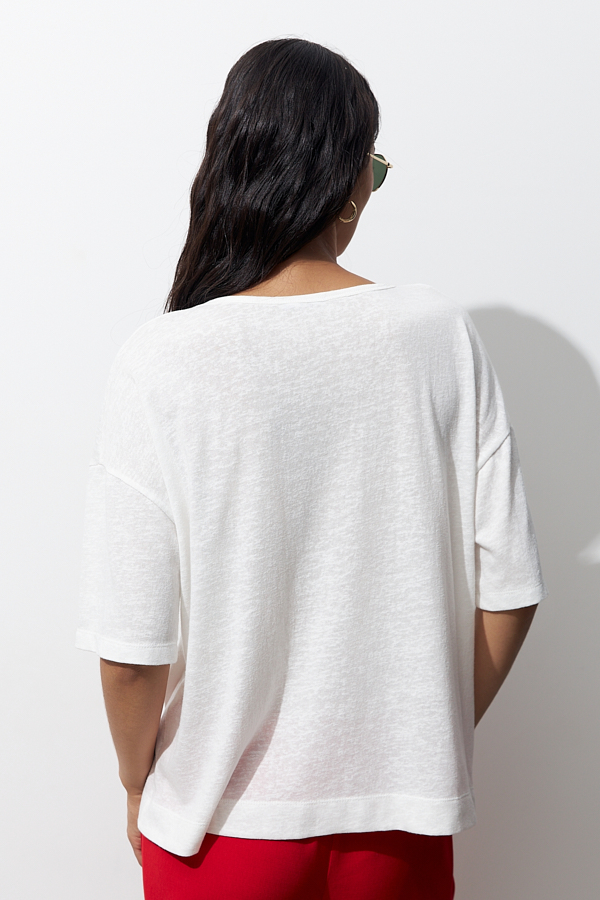 Джемпер из хлопкового эластичного полотна. Свободный силуэт со спущенной линией плеча и рукавом до локтя. Вырез горловины окантован эластичной бейкой. В таблице размеров представлены параметры человека, а не изделия.