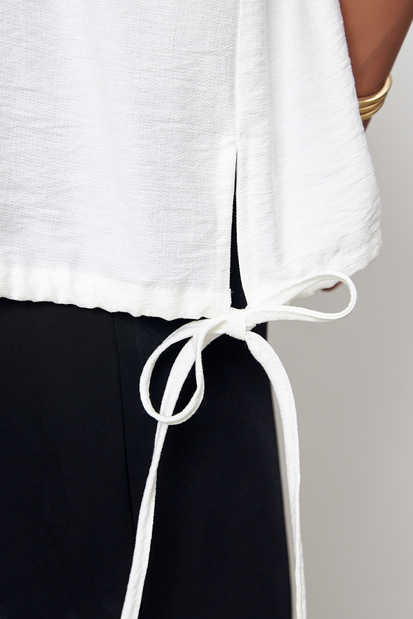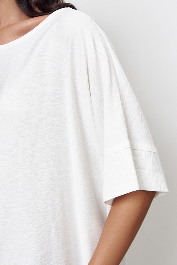 Блуза из вискозной ткани с крэш-эффектом. Очень свободный силуэт с небольшими разрезами по бокам. Круглый вырез горловины. Цельнокроеный рукав с притачной манжетой. Низ изделия затягивается на кулиску.