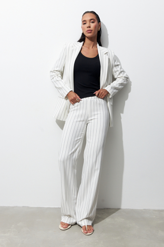 Брюки прямого силуэта из костюмной ткани. Пояс притачной с эластичной резиной.