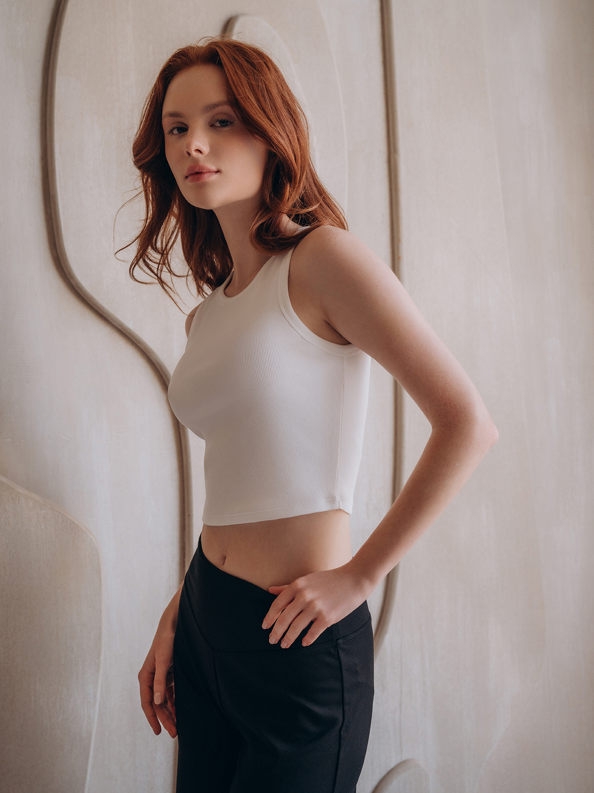 Облегающий белый топ из мягкого хлопкового полотна с добавлением эластана для эластичности и комфорта. Плотная ткань в мелкий рубчик сохраняет форму и подчеркивает силуэт.