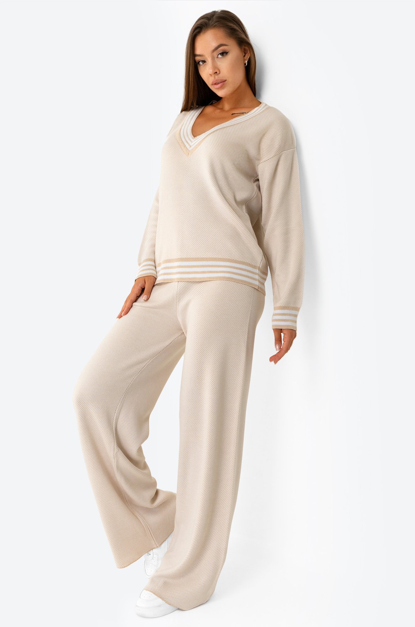 Женский вязаный костюм в бежевых оттен..показатьках с диагональной полоской — это сочетание комфорта, актуального дизайна и элегантности.