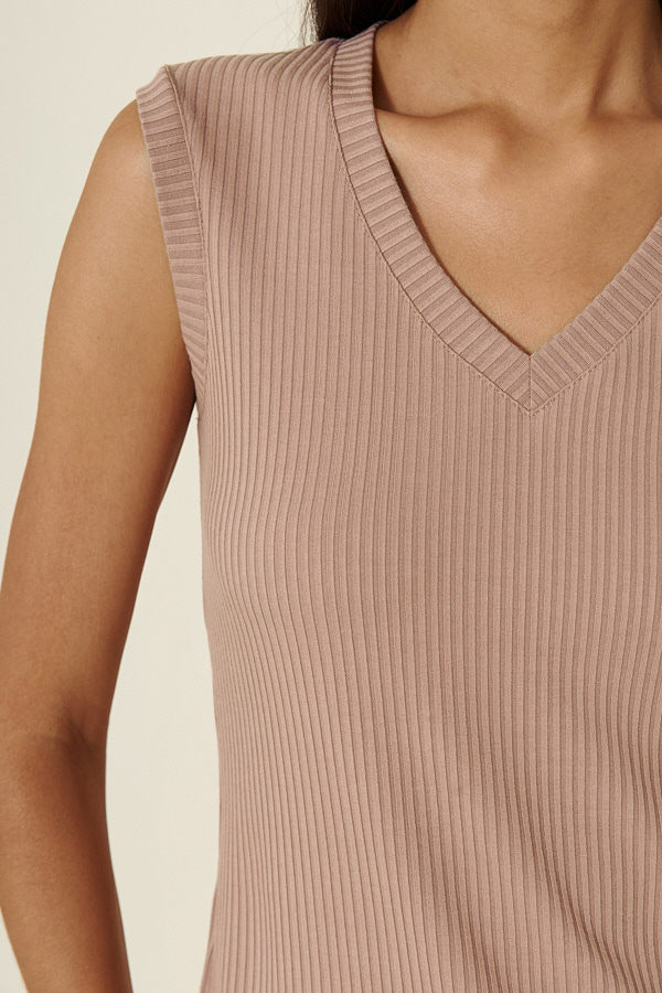 Джемпер прилегающего силуэта из эластичного полотна в рубчик. V-образный вырез горловины и линия проймы оформлены бейками.