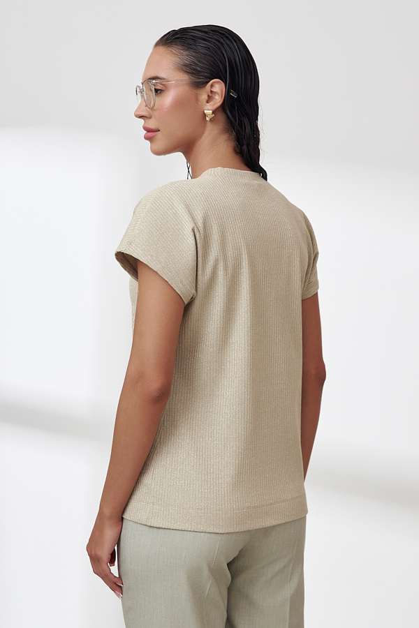 Джемпер свободного силуэта из фактурного эластичного полотна с люрексом. Цельнокроеный короткий рукав. Круглый вырез горловины оформлен бейкой. Женский джемпер стал незаменимой и популярной разновидностью одежды, которая может применяться буквально во всех случаях жизни.