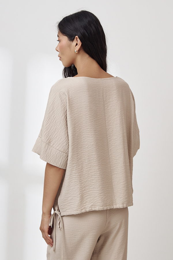 Блуза из вискозной ткани с крэш-эффектом. Очень свободный силуэт с небольшими разрезами по бокам. Круглый вырез горловины. Цельнокроеный рукав с притачной манжетой. Низ изделия затягивается на кулиску.
