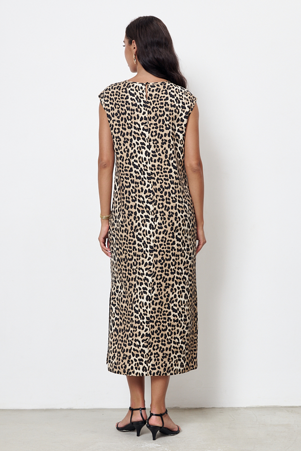 Платье из вискозной ткани. Полуприлегающий силуэт, с разрезом в боковом шве. По среднему шву спинки застёжка на петлю-пуговицу. Круглый вырез горловины и линия проймы окантованы косыми бейками из основной ткани.