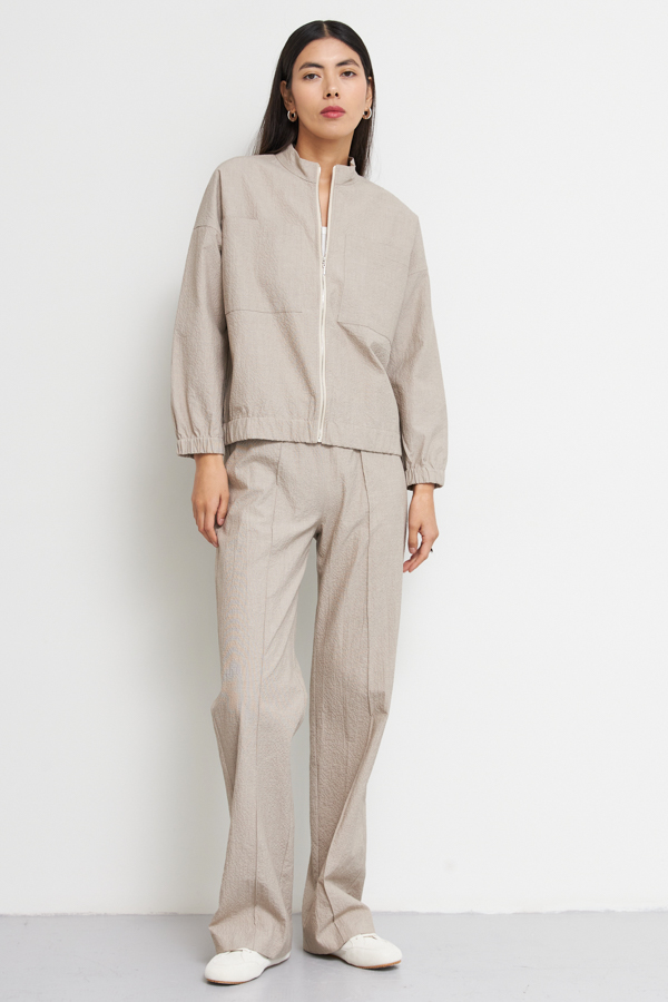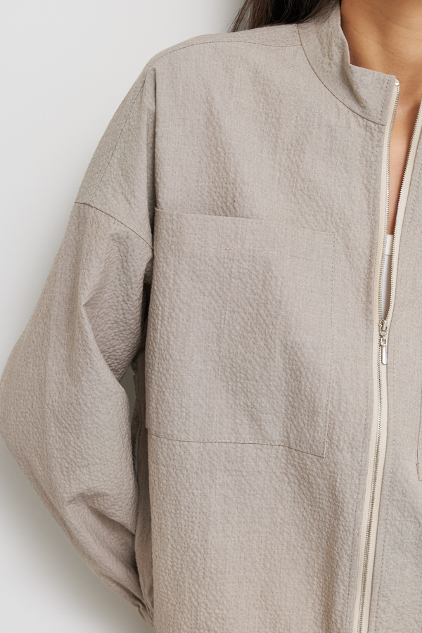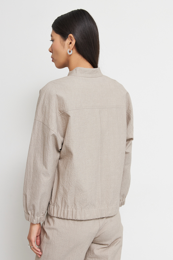Жакет-бомбер выполнен из фактурной хлопковой ткани. Свободный силуэт с застёжкой-молнией и накладными карманами. Рукав втачной в спущенную пройму. Нижняя часть рукава и низ изделия присборены на резинку. Линия горловины оформлена воротником-стойкой.