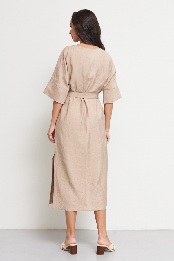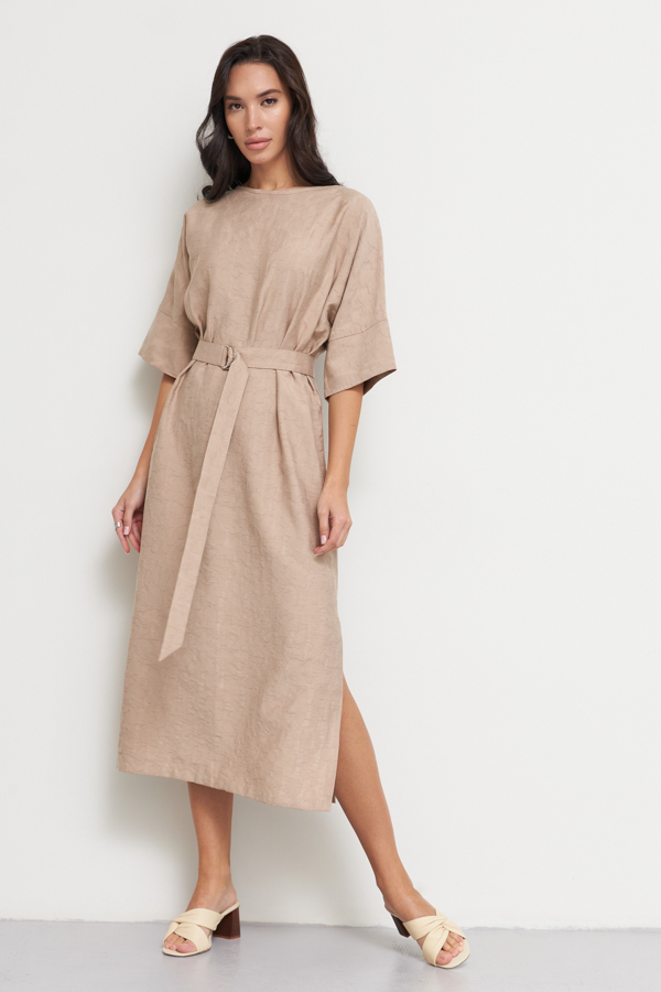 Платье из фактурной вискозной ткани. Свободный силуэт, с разрезом в боковом шве. Круглый вырез горловины окантован косой бейкой из основной ткани. Цельнокроеный рукав с притачной манжетой. В комплекте пояс из основной ткани. В таблице размеров представлены параметры человека, а не изделия.