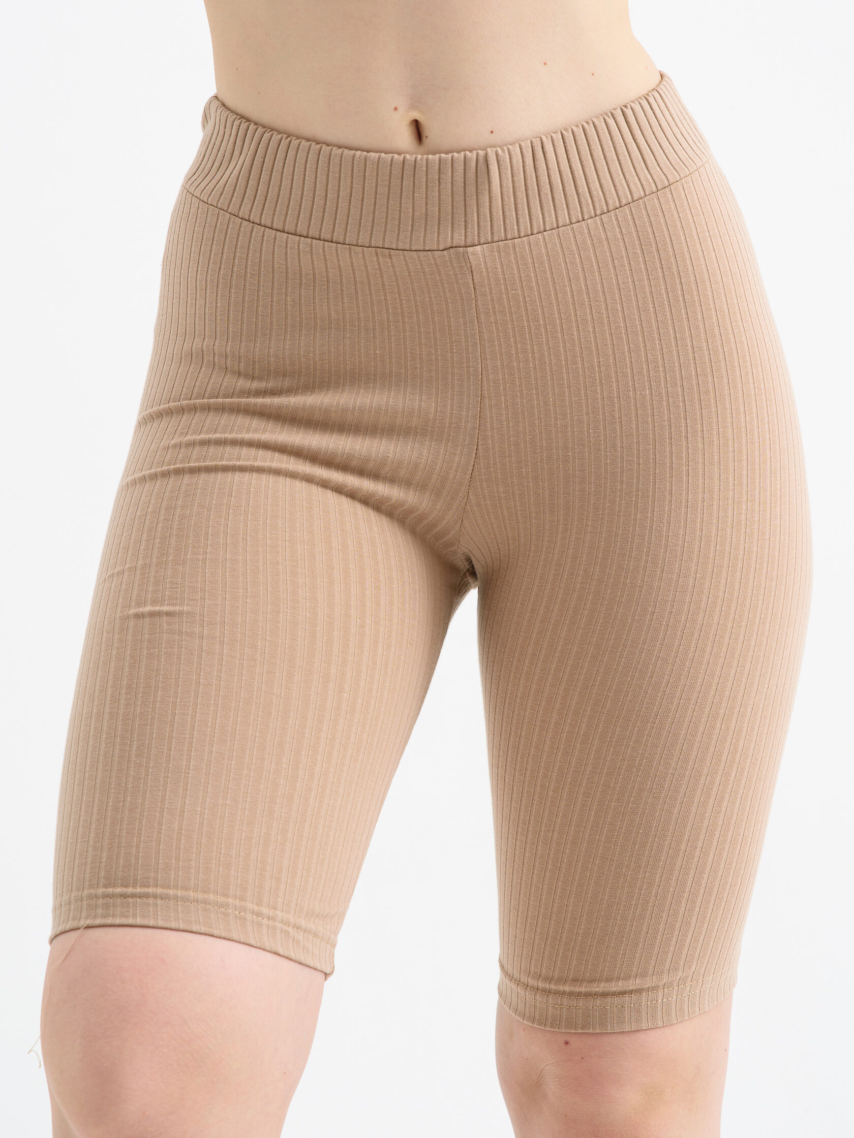 Спортивные женские велосипедки изготовлены из однотонного трикотажного х/б полотна с выработкой «рубчик». Изделие плотного прилегания и высокой посадкой на фигуре, с широким притачным поясом на резинке.