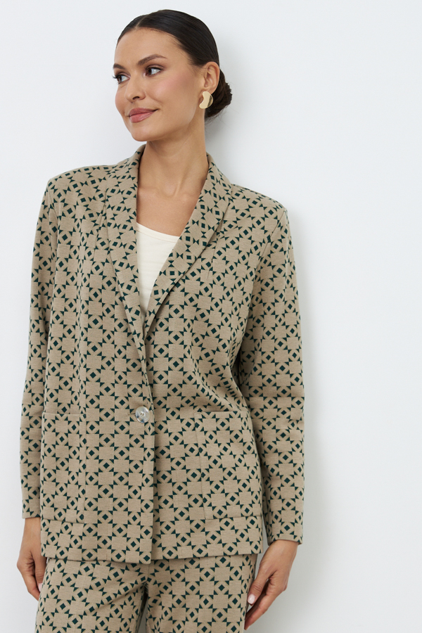 Костюм из эластичного полотна. Брюки прямого силуэта. Пояс с эластичной резиной. Жакет прямого свободного кроя с женственным шалевым воротником. На передней части изделия застёжка на пуговицу и накладные карманы. Втачной рукав. Изделие с плечевыми накладками, которые при желании можно убрать.