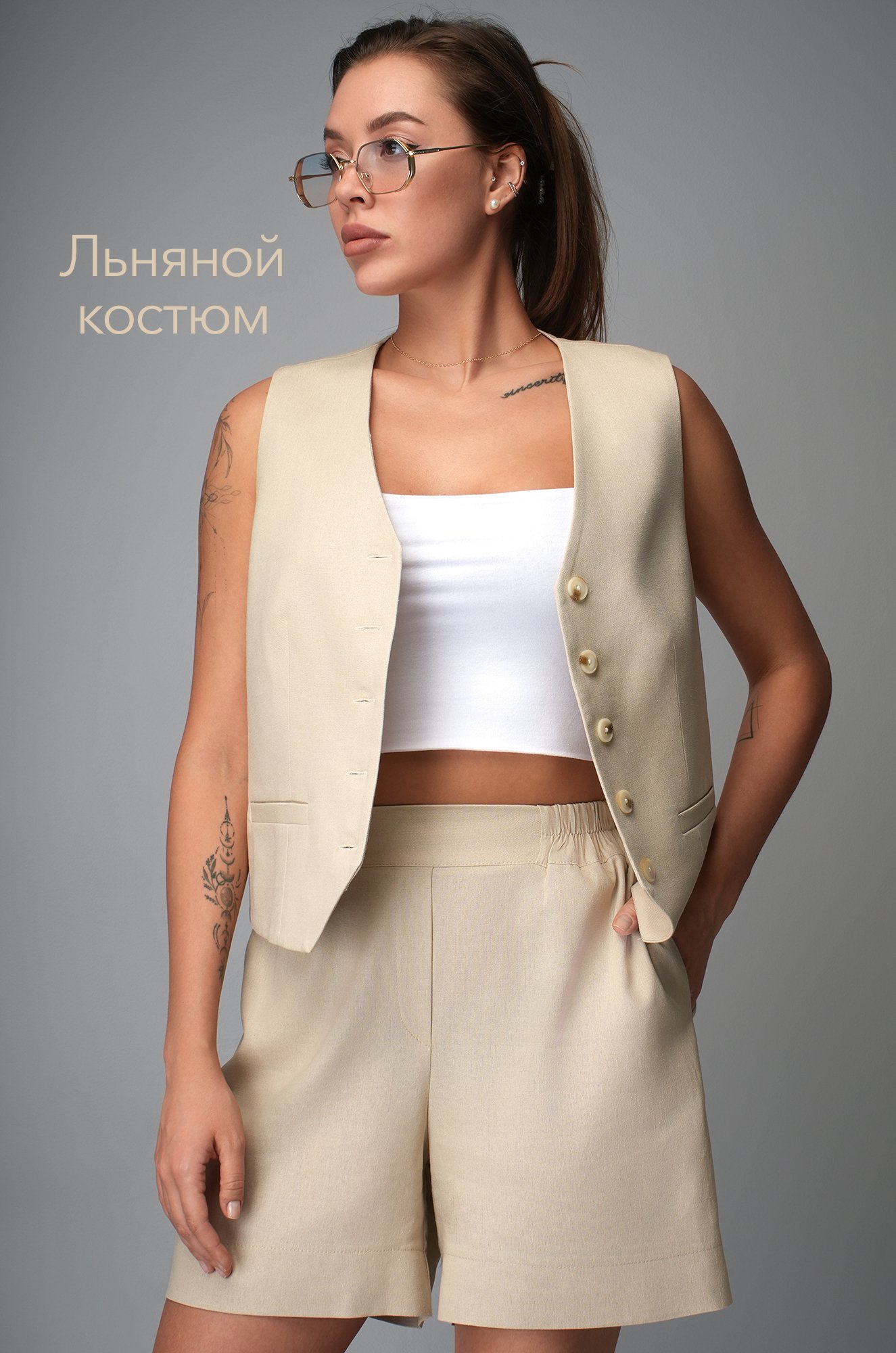 Жилет с подкладкой имеет V-вырез и застежку на пуговицы, добавляющие изысканности в облик, а декоративные карманы-обманки придают особую элегантность. Прямые шорты с широкой резинкой в поясе, дополненные боковыми карманами, создают комфорт и функциональность, подчеркивая расслабленный стиль и удобство в движении.