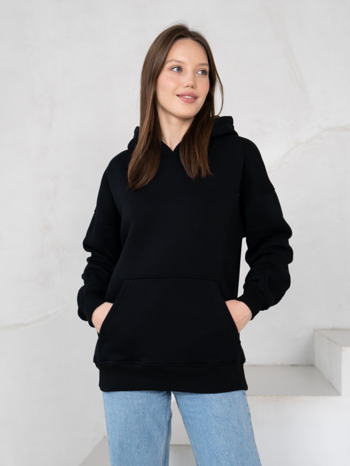 Толстовка свободного силуэта с карманом - кенгуру и капюшоном. Рукава на манжетах, низкая линия плечевого шва, цельный притачной пояс по низу изделия.