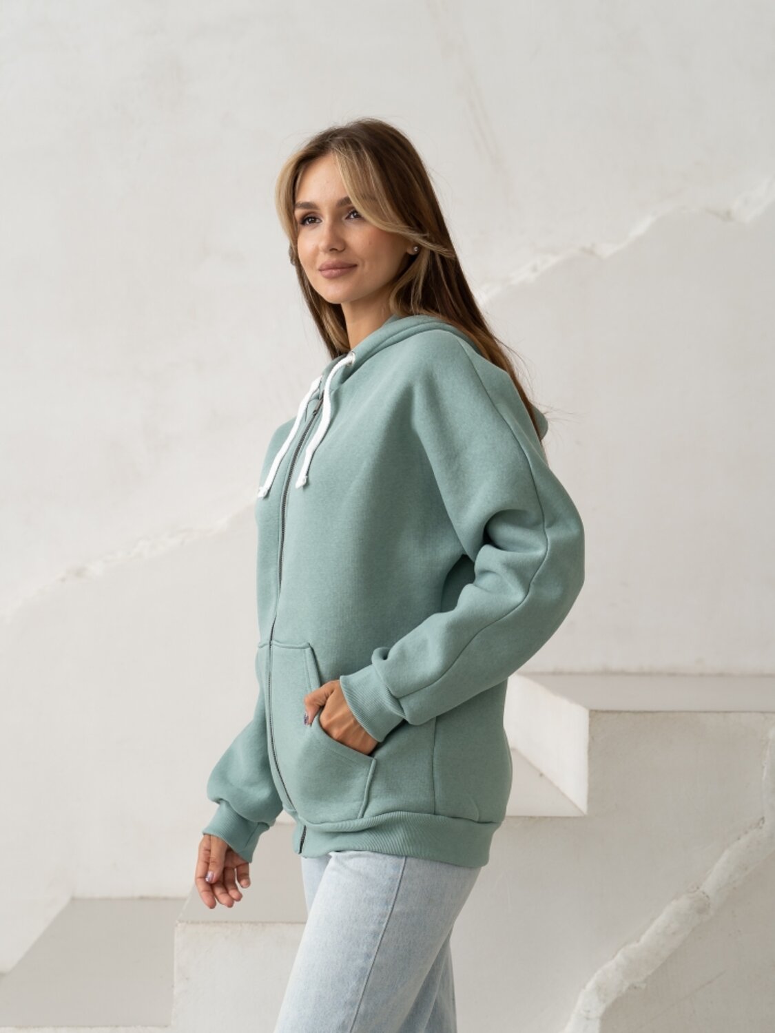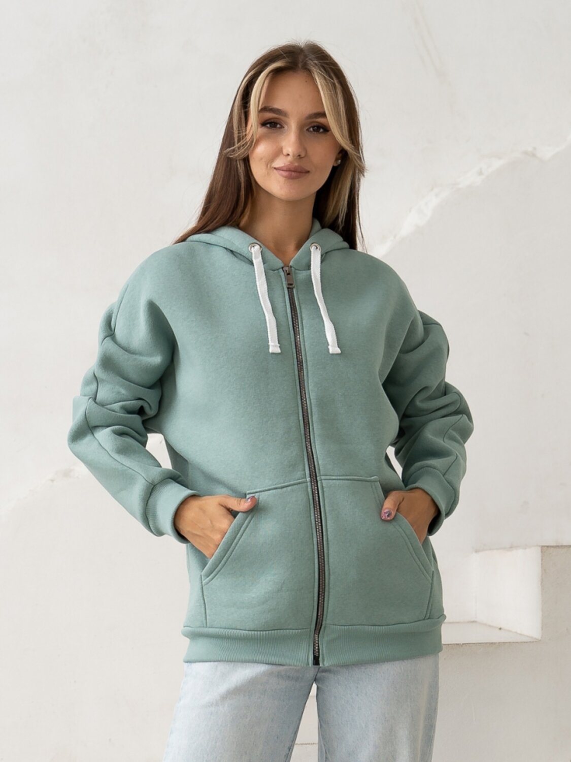 Толстовка с большим капюшоном с декоративным шнуром и карманами «кенгуру» из трикотажа с теплым начесом согреет в холода. Капюшон можно эффектно надеть на голову тем юным модницам, которые не хотят носить шапки.Толстовка с цельнокроеными рукавами и капюшоном застегивается на молнию. Накладные карманы «кенгуру». Рукав и низ изделия на манжетной резинке.