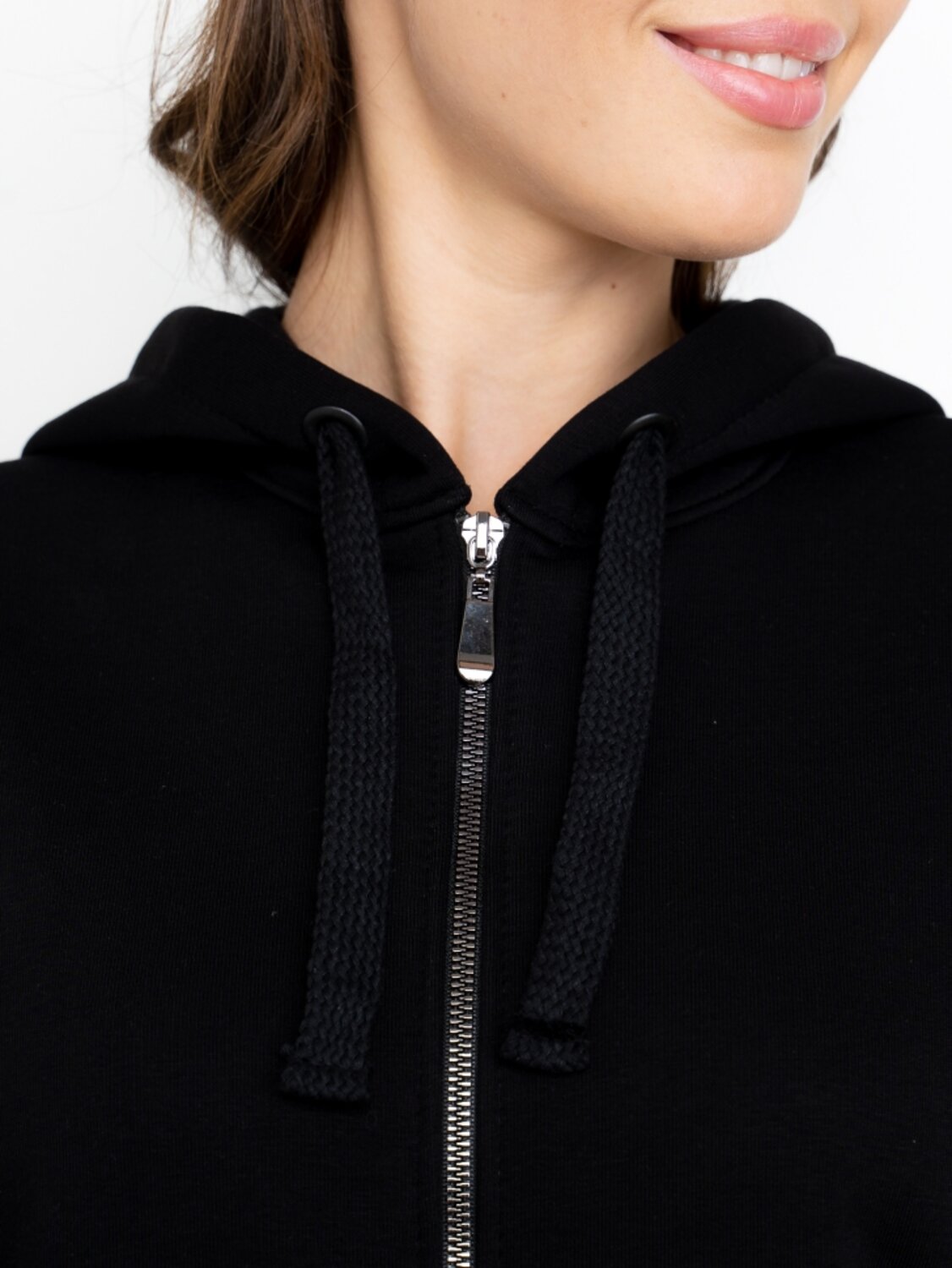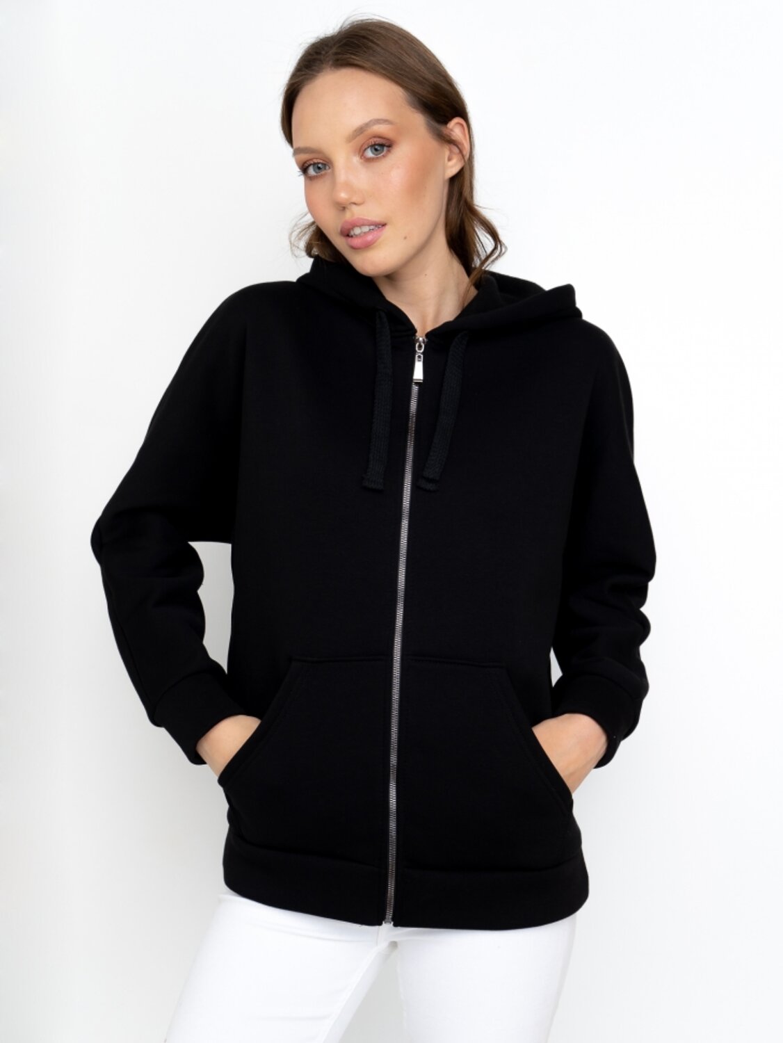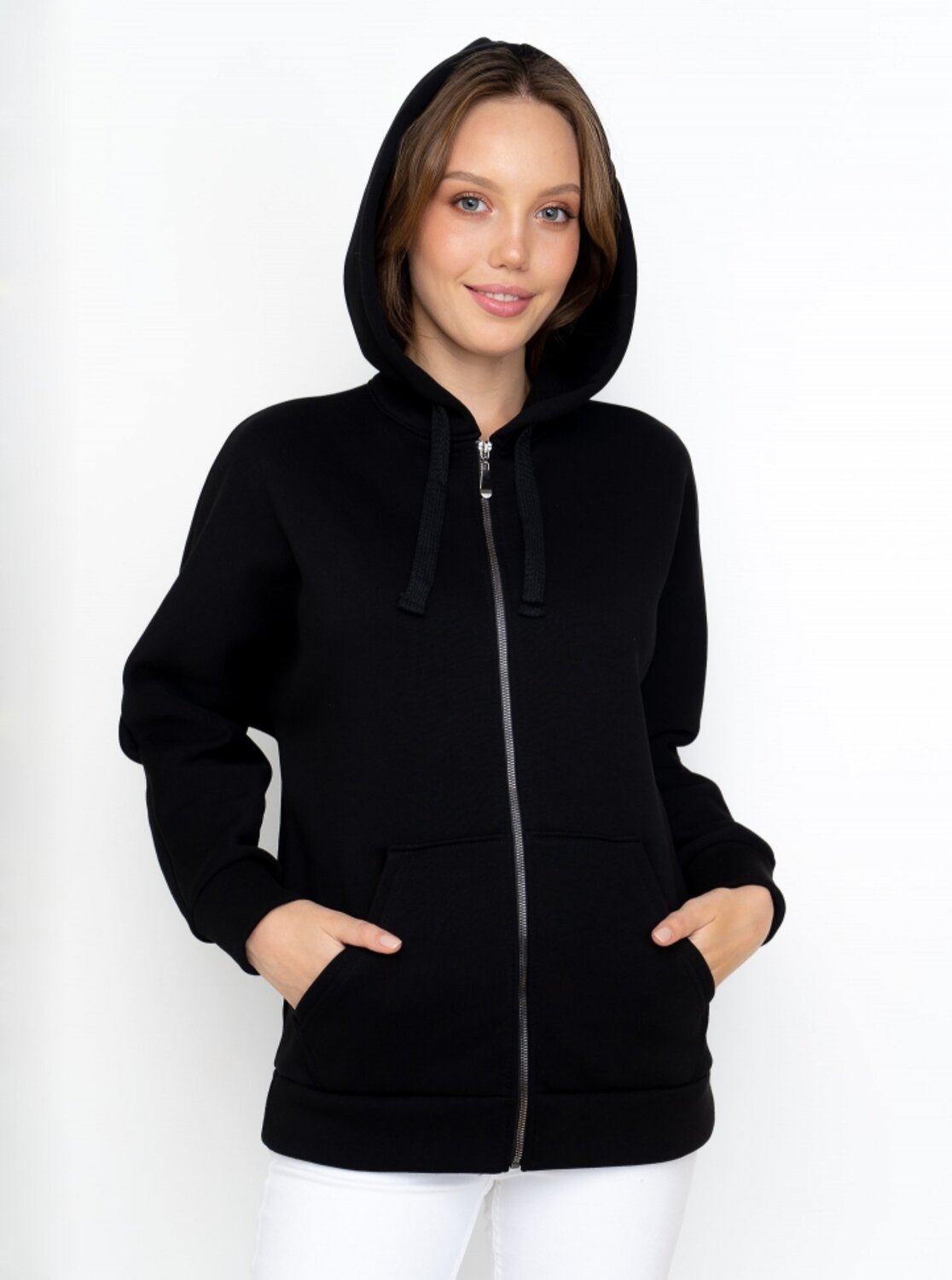 Толстовка с большим капюшоном с декоративным шнуром и карманами «кенгуру» из трикотажа с теплым начесом согреет в холода. Капюшон можно эффектно надеть на голову тем юным модницам, которые не хотят носить шапки.Толстовка с цельнокроеными рукавами и капюшоном застегивается на молнию. Накладные карманы «кенгуру». Рукав и низ изделия на манжетной резинке.