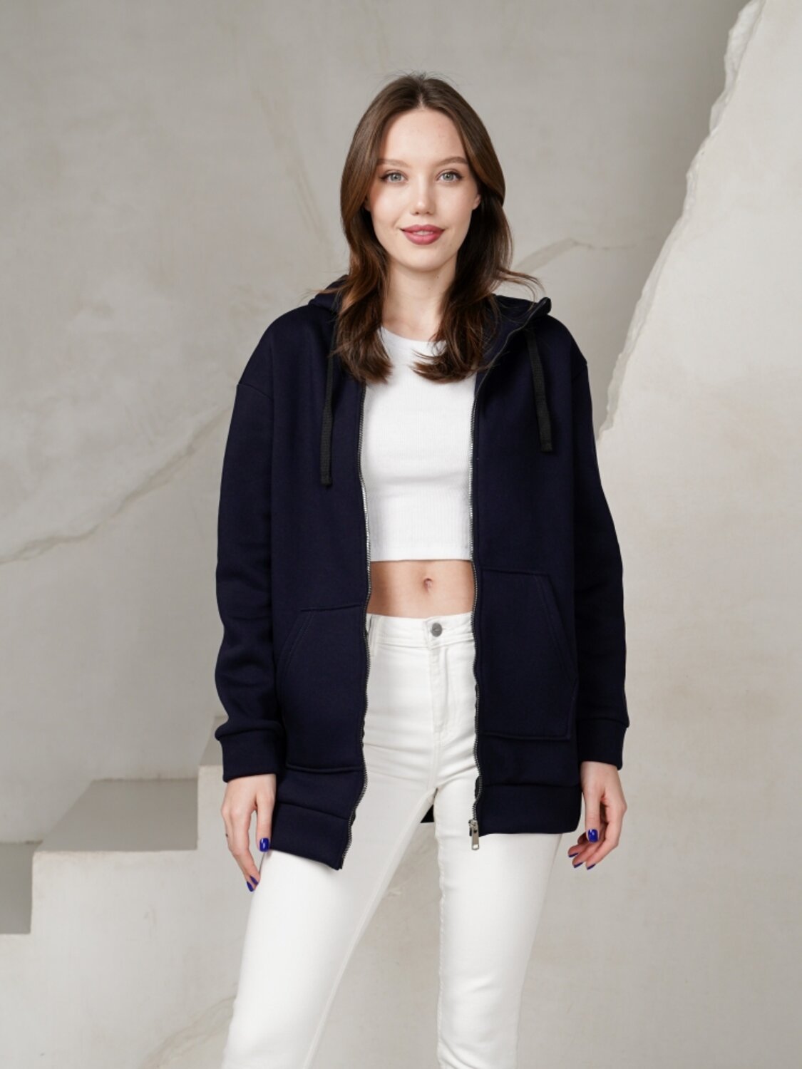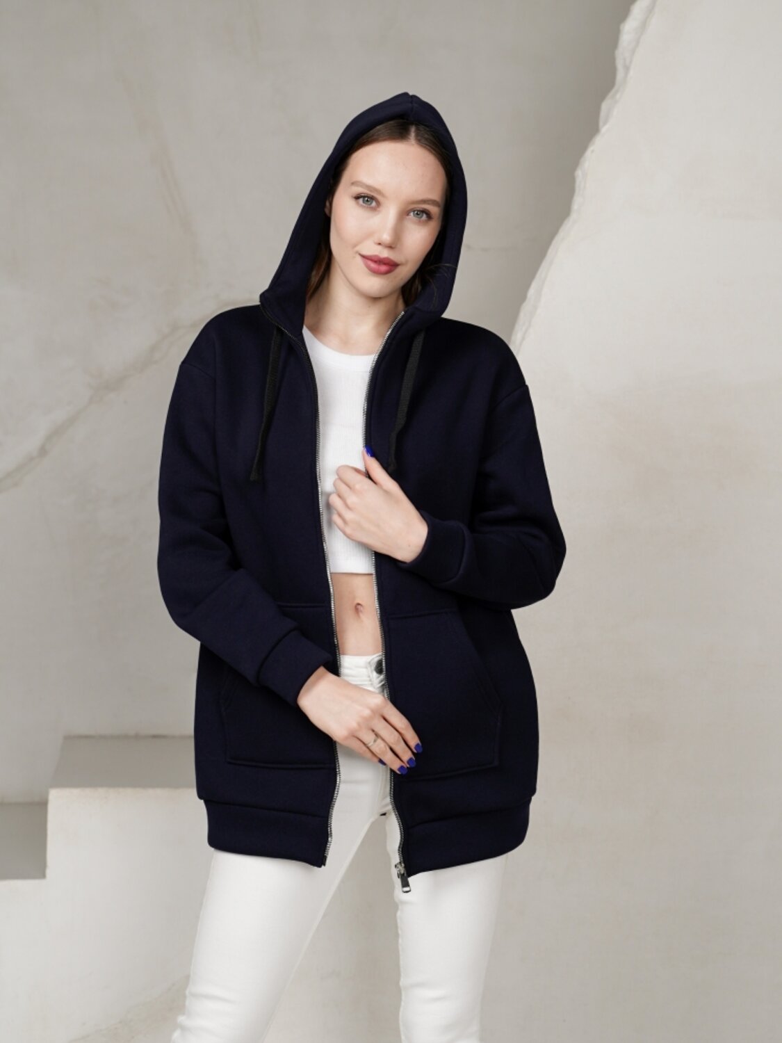 Удлиненная женская толстовка свободного силуэта с центральной застежкой «молния - трактор». Объемный капюшон с люверсами регулируется широким шнуром. На полочке размещены карманы-кенгуру. Широкая планка по низу изделия обеспечивает хорошее прилегание по фигуре.