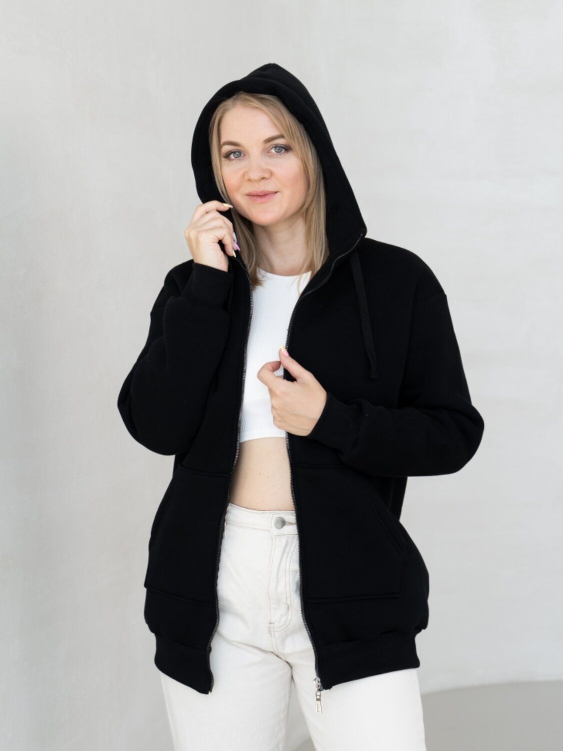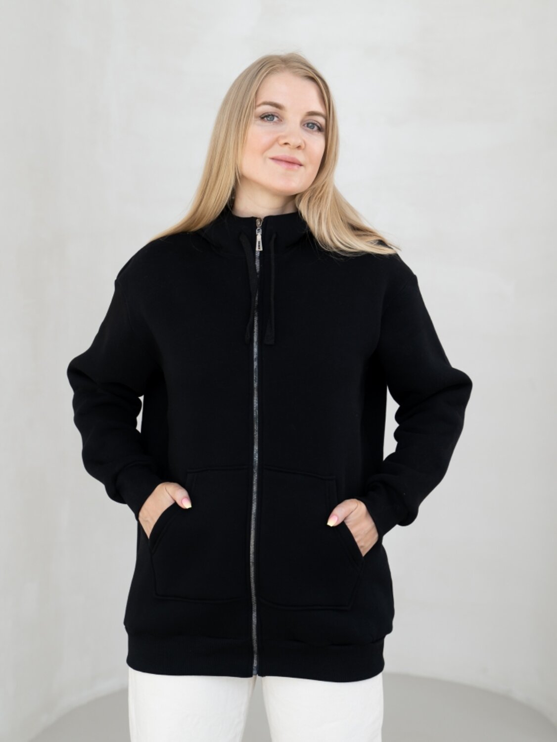 Удлиненная женская толстовка свободного силуэта с центральной застежкой «молния - трактор». Объемный капюшон с люверсами регулируется широким шнуром. На полочке размещены карманы-кенгуру. Широкая планка по низу изделия обеспечивает хорошее прилегание по фигуре.