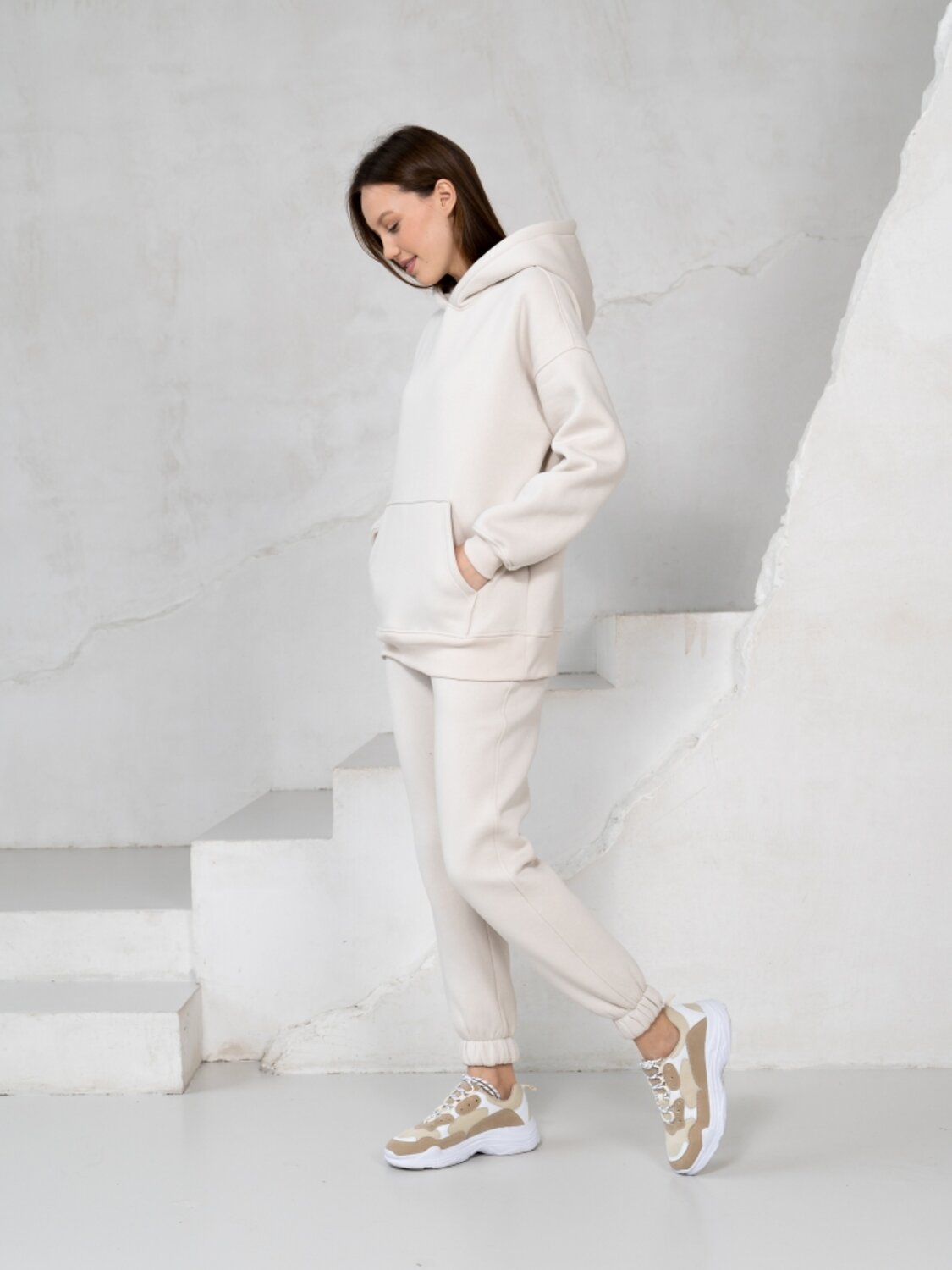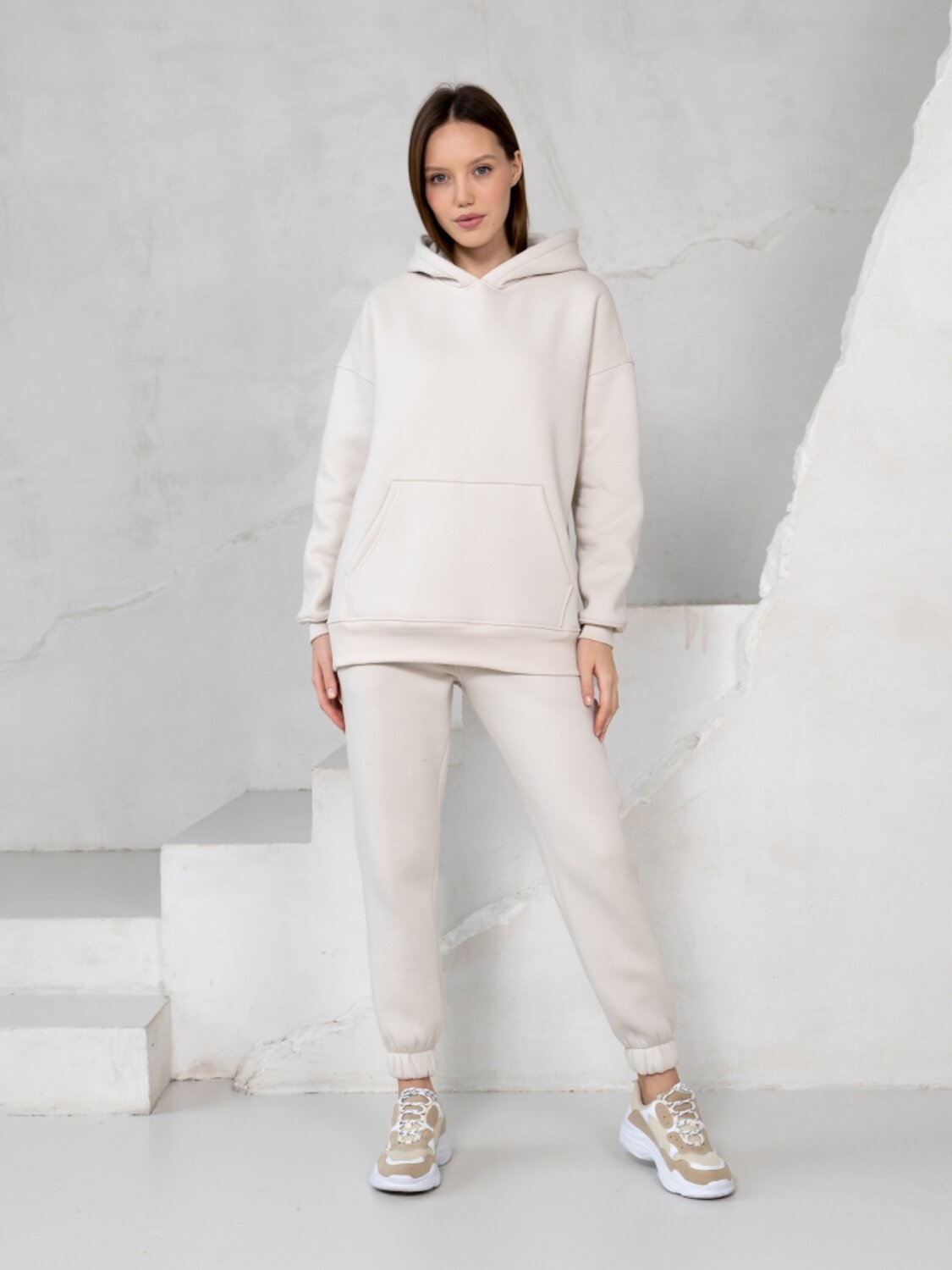 Комплект для повседневной носки в осеннее - зимний период состоит из брюк и толстовки. Толстовка свободного силуэта с карманом - кенгуру и капюшоном. Длинные рукава на манжетах, низкая линия плечевого шва. Брюки высокой посадки на резинках. Пояс брюк выполнен из резинки и регулируется шнуром. Зимой такой костюм лучше всего сочетать с классическим верхом, например, с длинным пальто, шубкой-чебурашкой или пуховиком, причем капюшон можно всегда эффектно вытащить поверх воротника верхней одежды. Костюм пошит из очень комфортной к телу ткани на основе 80 % хлопка – футер начес. Лицевая сторона очень мягкая и гладкая, а плотный и густой ворс изнанки согреет в прохладную погоду и защитит от ветра.