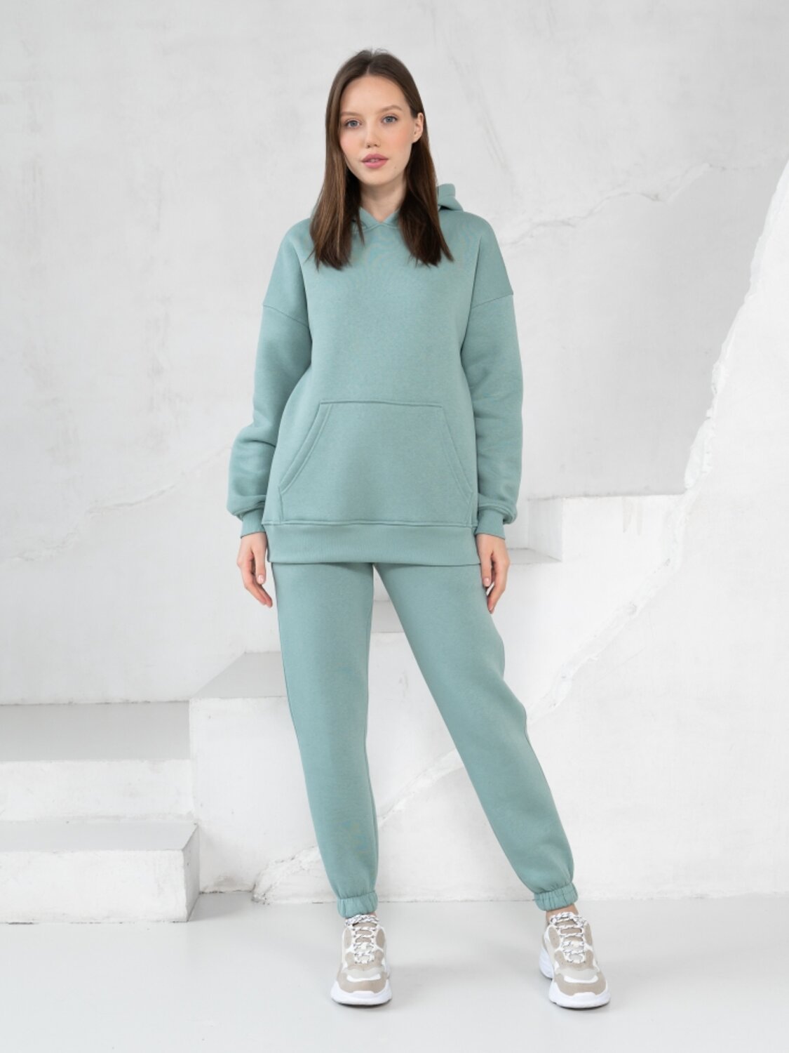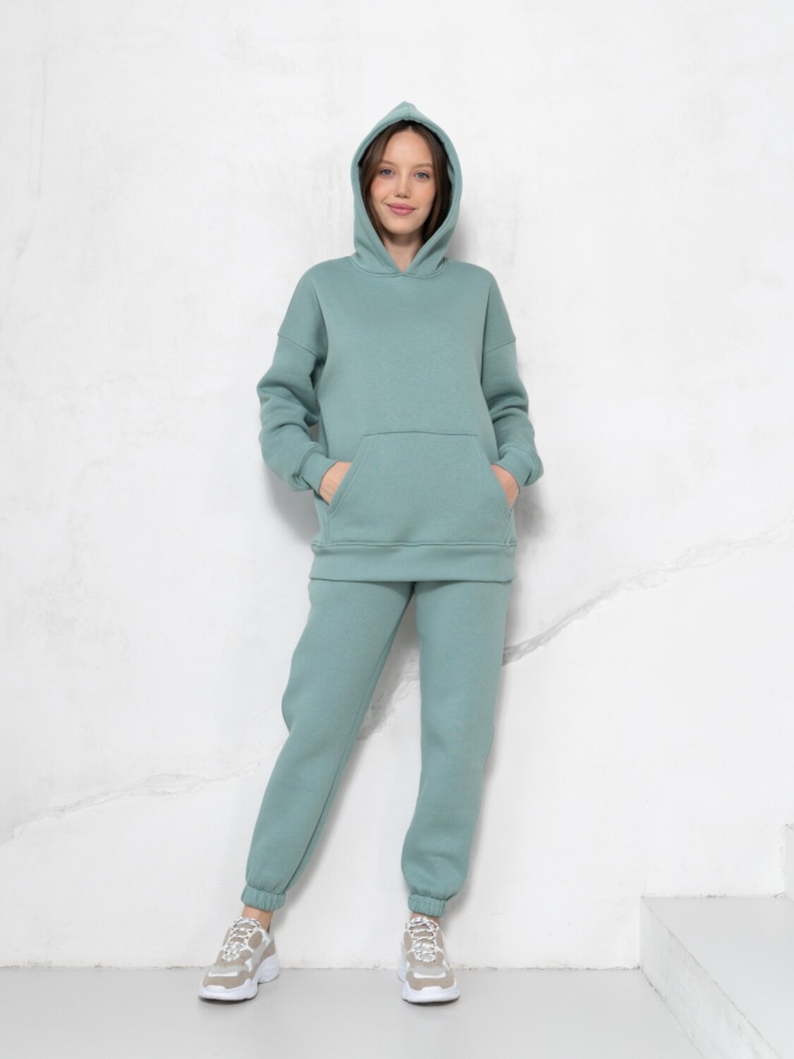 Комплект для повседневной носки в осеннее - зимний период состоит из брюк и толстовки. Толстовка свободного силуэта с карманом - кенгуру и капюшоном. Длинные рукава на манжетах, низкая линия плечевого шва. Брюки высокой посадки на резинках. Пояс брюк выполнен из резинки и регулируется шнуром. Зимой такой костюм лучше всего сочетать с классическим верхом, например, с длинным пальто, шубкой-чебурашкой или пуховиком, причем капюшон можно всегда эффектно вытащить поверх воротника верхней одежды. Костюм пошит из очень комфортной к телу ткани на основе 80 % хлопка – футер начес. Лицевая сторона очень мягкая и гладкая, а плотный и густой ворс изнанки согреет в прохладную погоду и защитит от ветра.